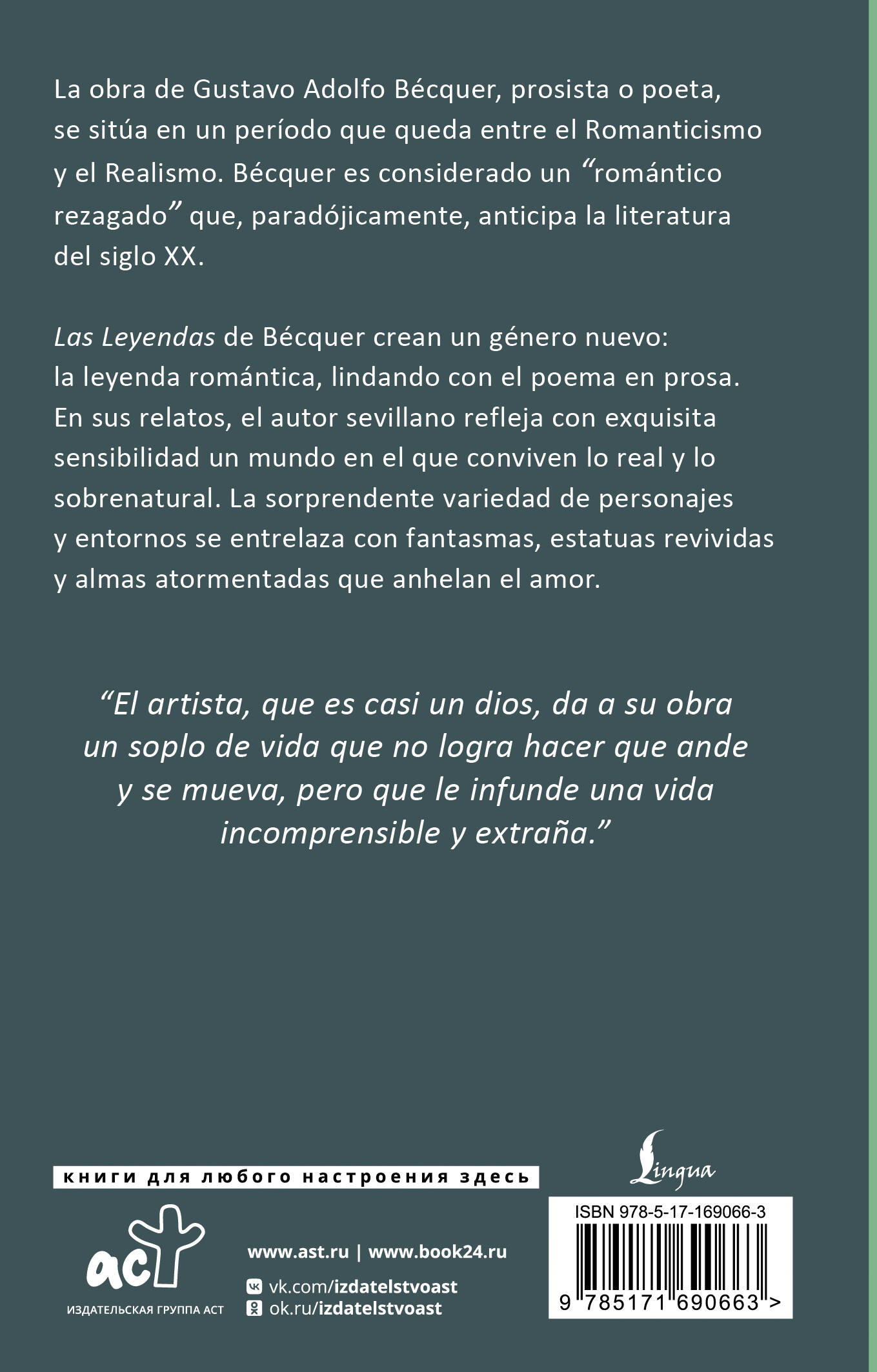 Легенды Беккера, вдохновленные природой и историей Кастилии, переносят читателя в эпоху славных королей, благородных рыцарей и прекрасных дам. От воина, полюбившего прекрасную статую, до охотника, преследующего белую лань, — каждый из персонажей жаждет того, чего не может иметь, и расплачивается за это.