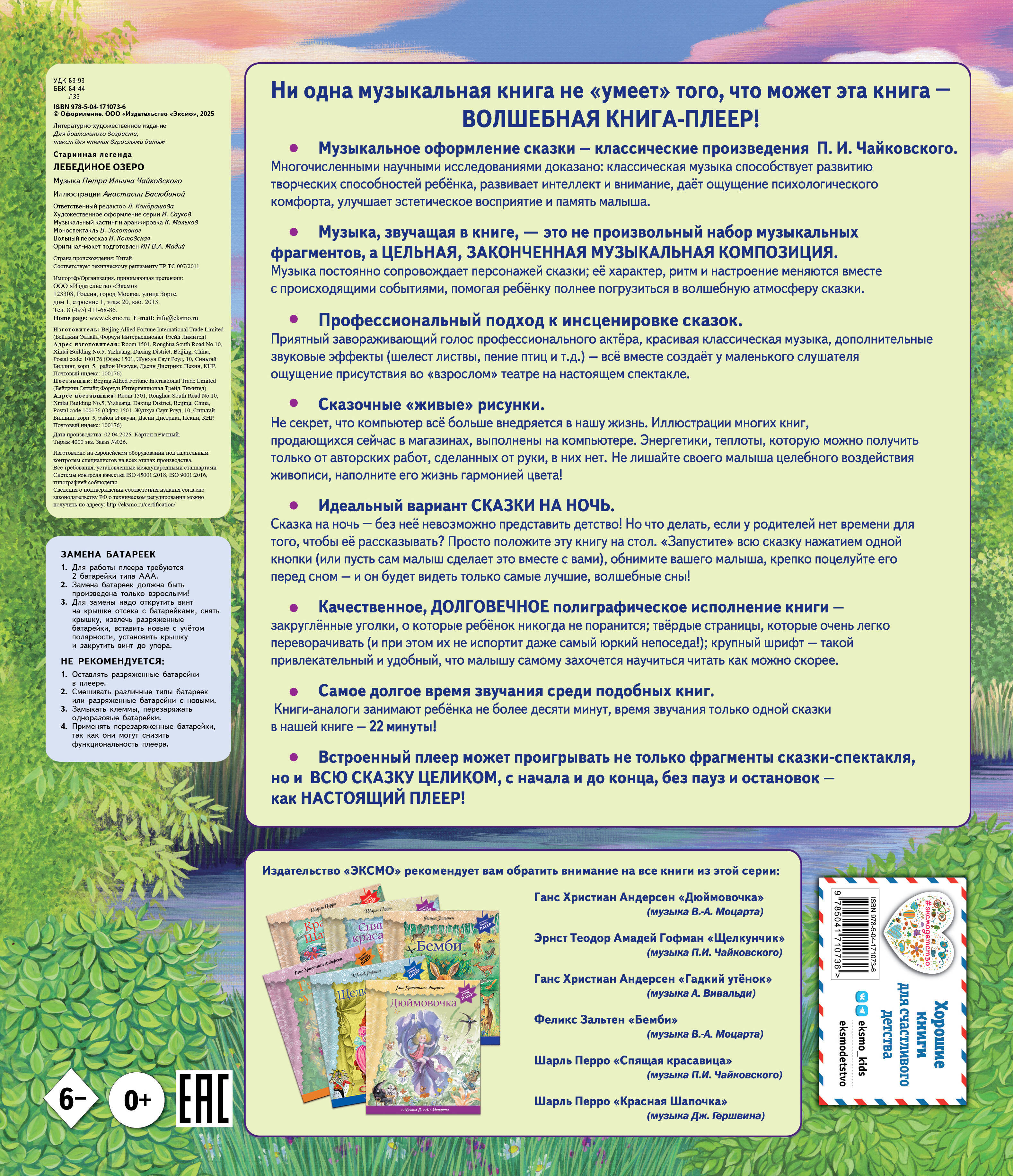 Музыкальная книга-плеер — это прекрасное сочетание традиционной книги и современных технологий. Красочное иллюстрированное издание классической сказки дополнено звуковым модулем-плеером. Яркие, крупные кнопки на панели модуля позволяют прослушать сказку как по главам, так и полностью, от начала до конца, а также сделать паузу в прослушивании. Время звучания всей сказки — 25 минут, РЕКОРД СРЕДИ ЗВУКОВЫХ КНИГ. Наша книга — это идеальный вариант «сказки на ночь»: пока ребёнок слушает книгу и засыпает, взрослые могут заняться своими делами. Профессиональное художественное чтение текста сопровождается завершёнными музыкальными композициями — шедеврами мировой классики. Только в наших книгах-плеерах используются дополнительные звуки (шелест листвы, пение птиц и т. п.), создающие эффект присутствия на настоящем спектакле!