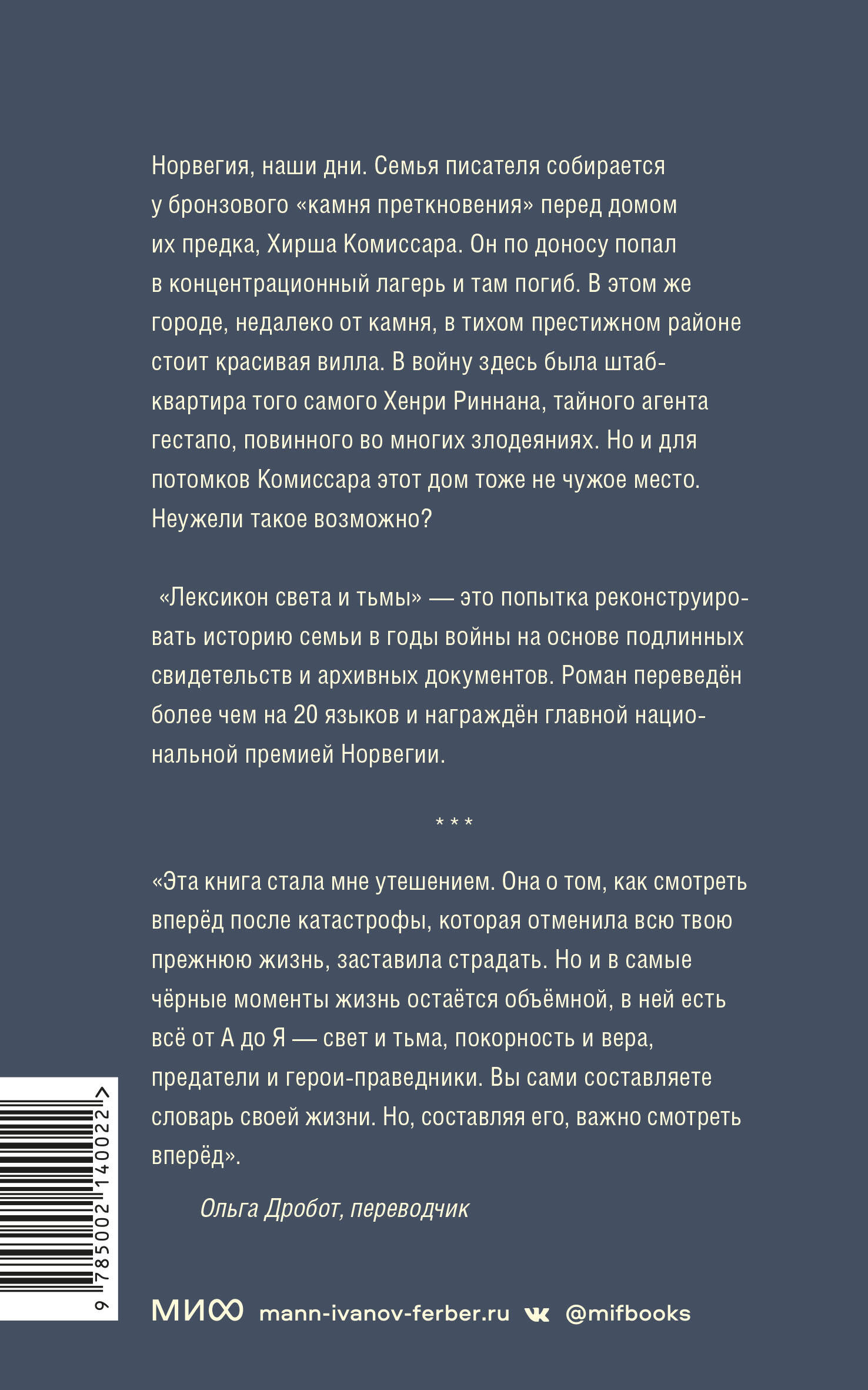 "Лексикон света и тьмы" — попытка реконструировать историю семьи в годы войны на основе подлинных свидетельств и архивных документов. Роман переведен более чем на 20 языков и награжден главной национальной премией Норвегии.