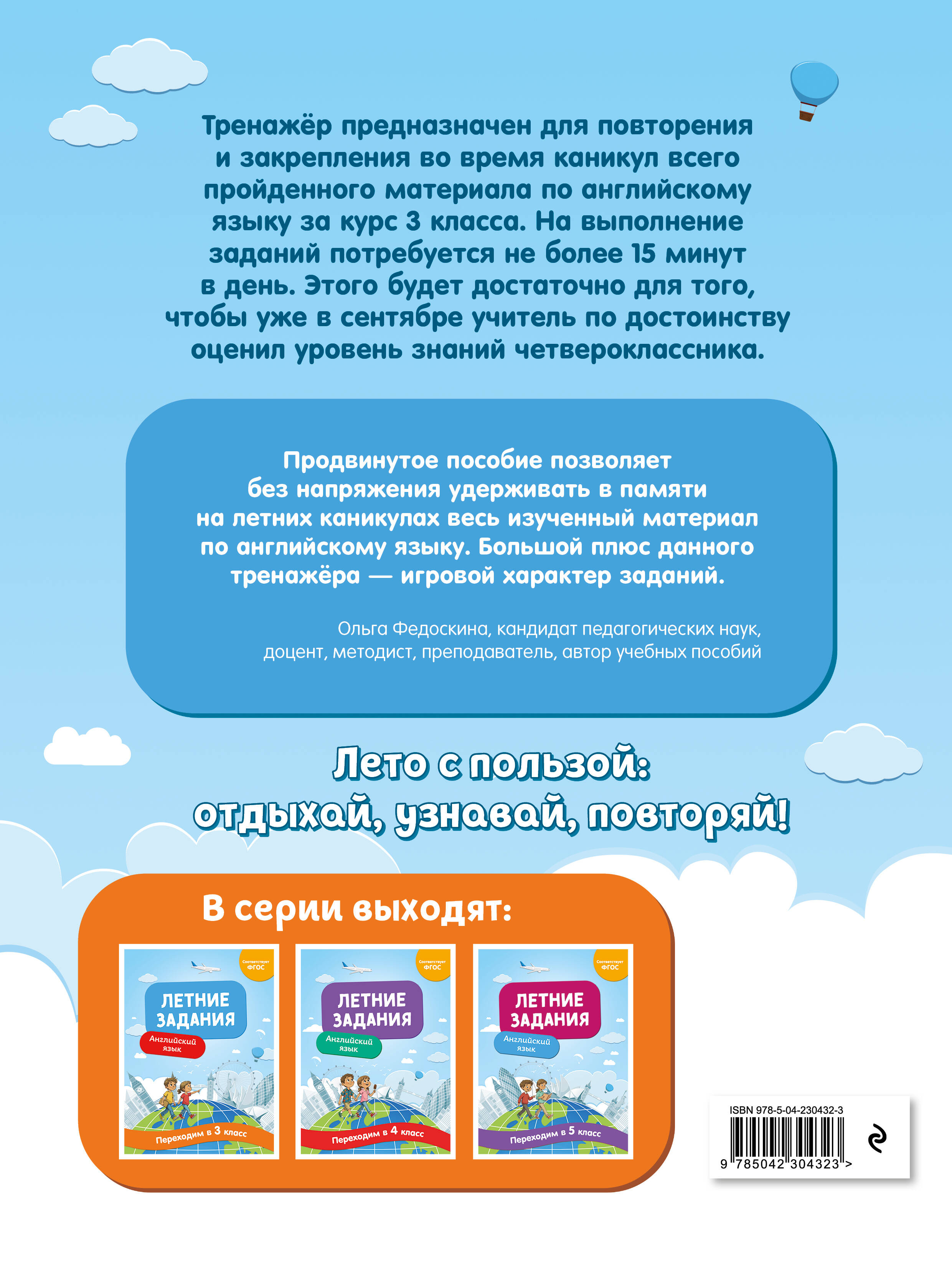 Летние каникулы — время отдыха, но 10—15 минут повторения в день помогут школьнику, перешедшему в 4 класс, не забыть пройденный ранее материал. На каждой странице тренажёра расположено от двух до четырёх заданий по английскому языку. Задания распределены равномерно, что позволяет сочетать отдых и занятия в период летних каникул без перегрузки ученика. Эта книга станет залогом успешного старта в новом учебном году по предмету English.