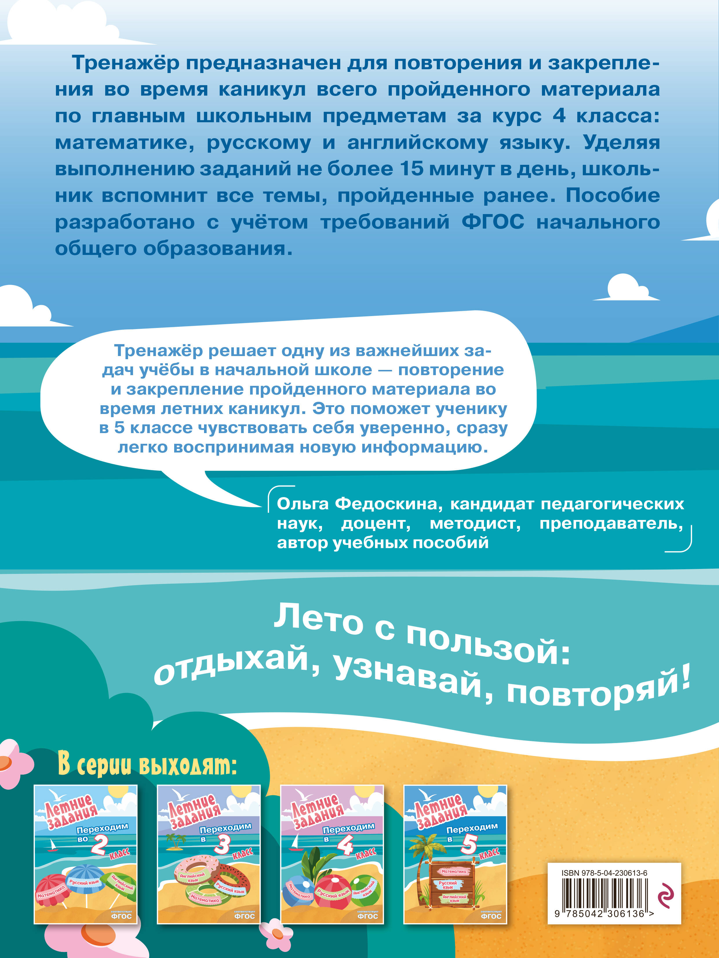 Летние каникулы — время отдыха, но 10—15 минут повторения в день помогут школьнику, перешедшему в 5 класс, не забыть пройденный ранее материал. Тренажёр состоит из 60 комбинированных занятий. На каждой странице помещены три задания: по математике, русскому и английскому языку. Задания распределены равномерно, что позволяет сочетать отдых и занятия в период летних каникул без перегрузки ученика.