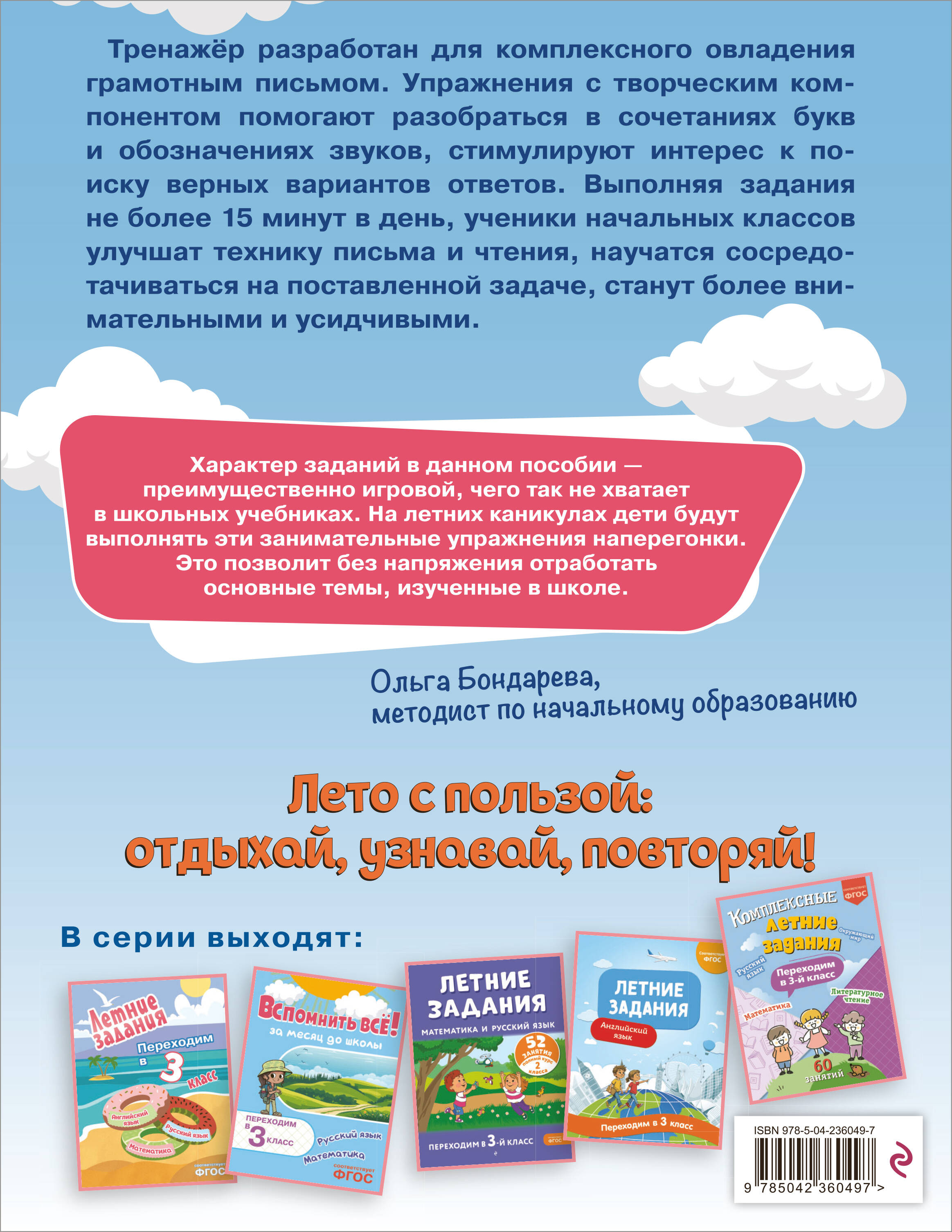 Тренажёр адресован школьникам, перешедшим в 3 класс, для занятий в период летних каникул. Цель пособия — формирование полноценного навыка правильного, грамотного и красивого письма, развития фонематического слуха, умения отличать звуки от букв. Тренажёр включает задания, направленные на развитие каллиграфических навыков, развитие памяти, внимания, языкового чутья, а также для коррекции проявлений дисграфии. К ним относятся стойкие, повторяющиеся ошибки (пропуски или замены букв, искажение слогов), зеркальное написание букв и их элементов, пропуски слогов, слитное написание слов. 10—15 минут занятий в день значительно повысят успеваемость школьника в следующем учебном году.