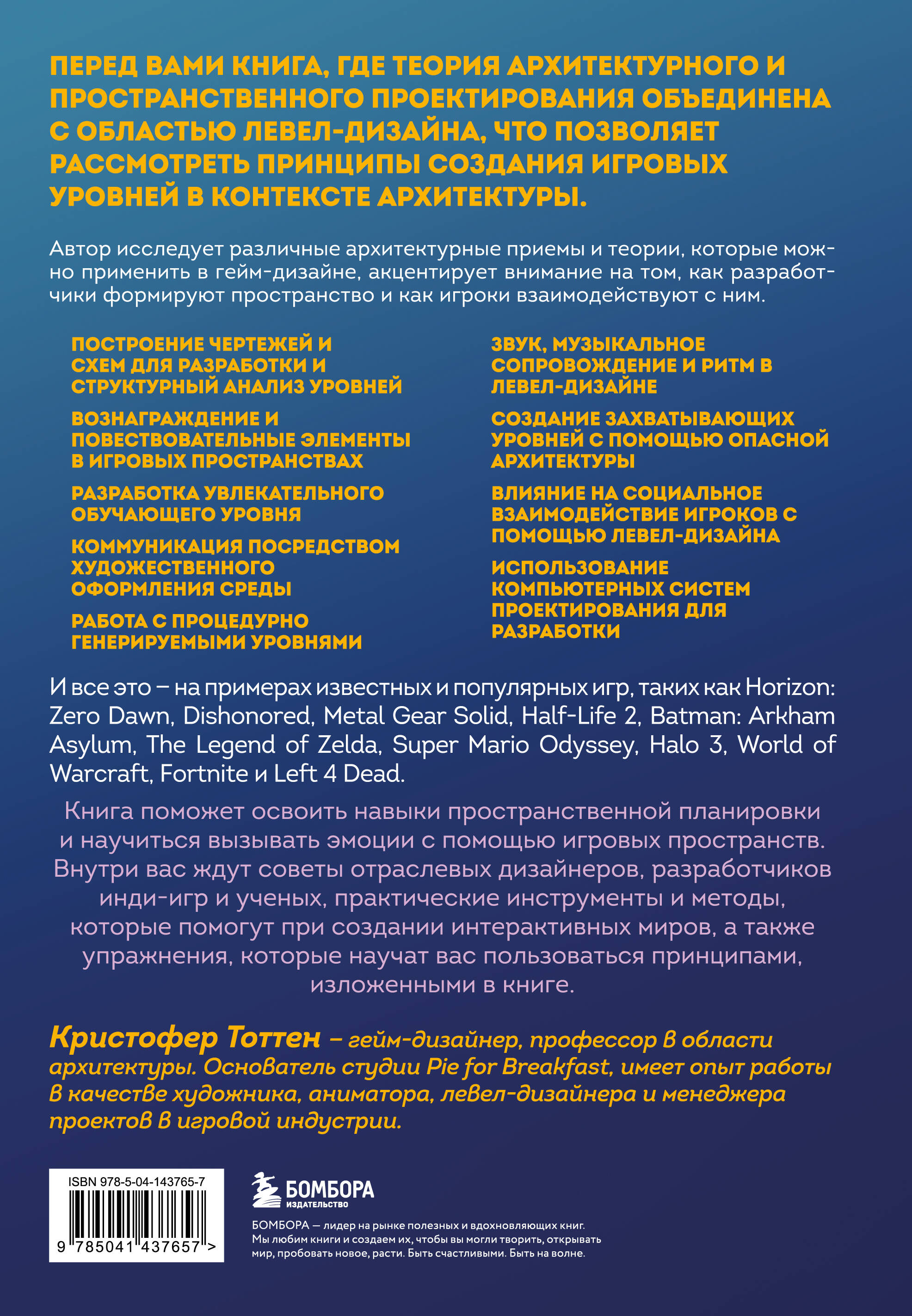 Перед вами книга, где теория архитектурного и пространственного проектирования объединена с областью левел-дизайна, что позволяет рассмотреть принципы создания игровых уровней в контексте архитектуры. Автор исследует различные архитектурные приемы и теории, которые можно применить в гейм-дизайне, акцентирует внимание на том, как разработчики формируют пространство и как игроки взаимодействуют с ним.