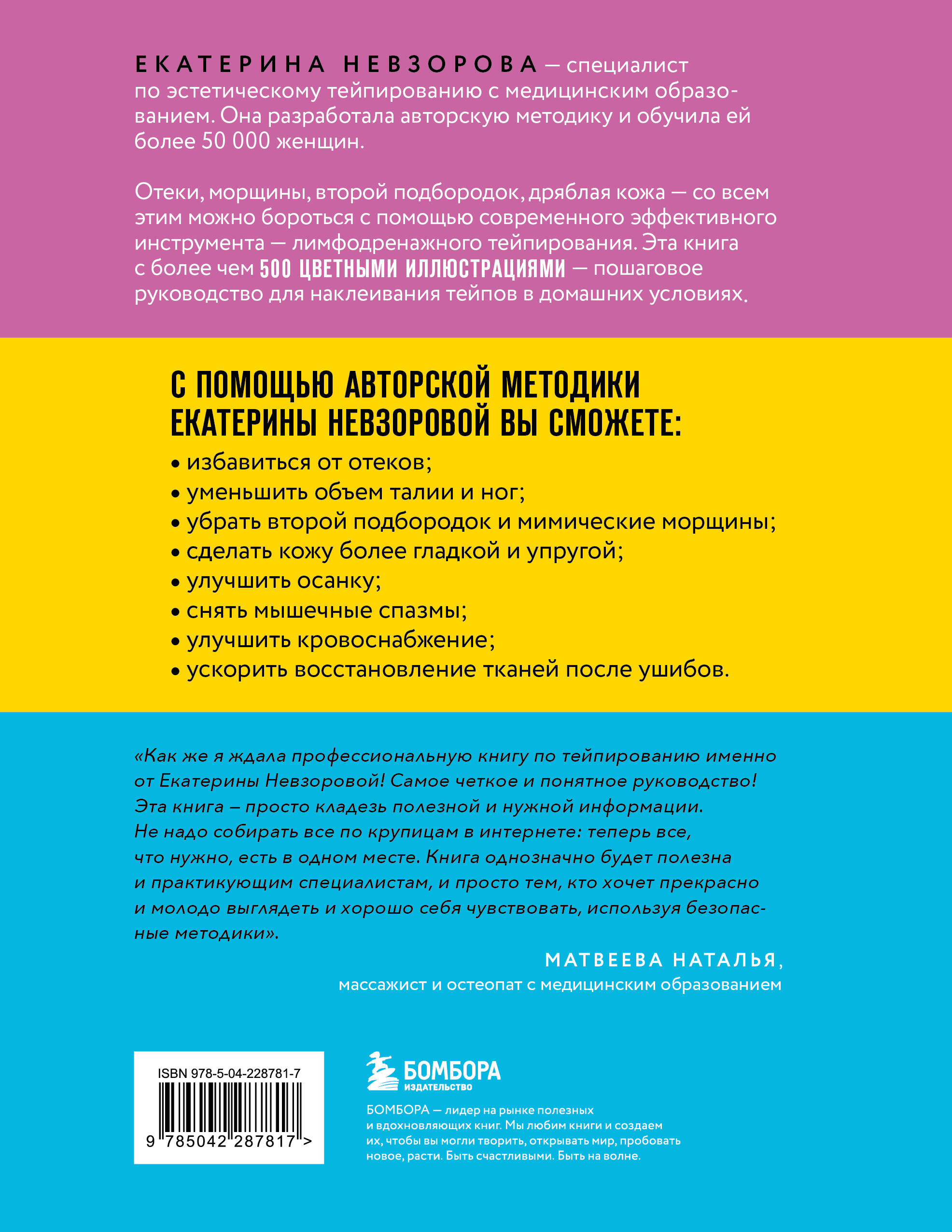 Внутри книги вы найдете подробные инструкции по использованию тейпов и более 500 наглядных иллюстраций, благодаря которым сможете достичь видимого результата в домашних условиях.