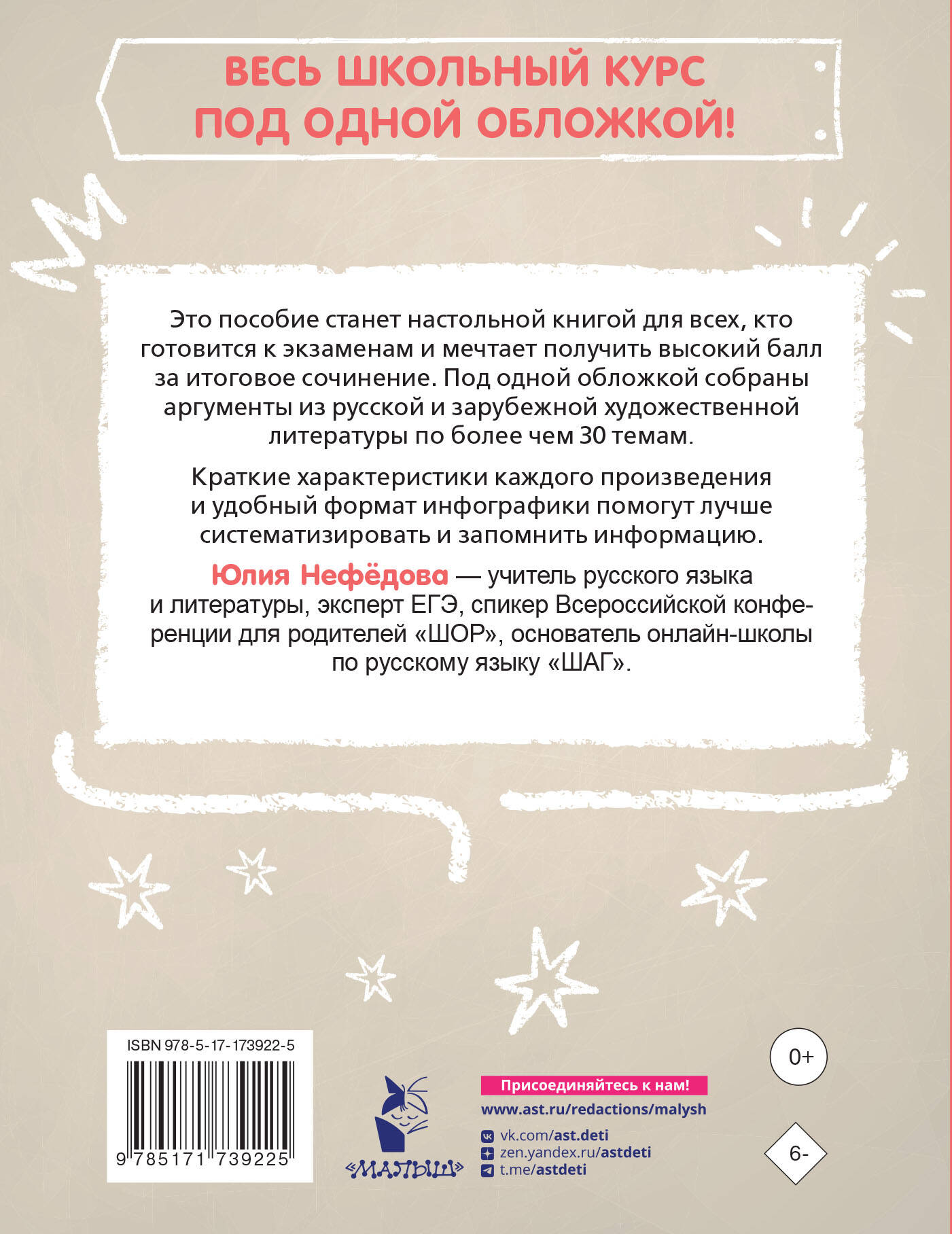 Это пособие поможет систематизировать знания по школьному курсу литературы и быстро подготовиться к сочинению. В книге собраны аргументы из русской и зарубежной литературы по более чем 30-ти темам. Краткие характеристики каждого произведения, цитаты и дополнительные факты помогут лучше систематизировать и запомнить информацию. Приложение с перечнем типовых ошибок ЕГЭ, тренажер по орфографии и пунктуации, словари литературных терминов и сложных слов обеспечат комплексную подготовку к ОГЭ и ЕГЭ по литературе и русскому языку. Автор книги Юлия Нефёдова — учитель русского языка и литературы, эксперт ЕГЭ, спикер Всероссийской конференции для родителей «ШОР» — поможет сдать экзамены на высший балл! Лучшая шпаргалка для для учеников 9, 10 и 11 классов.