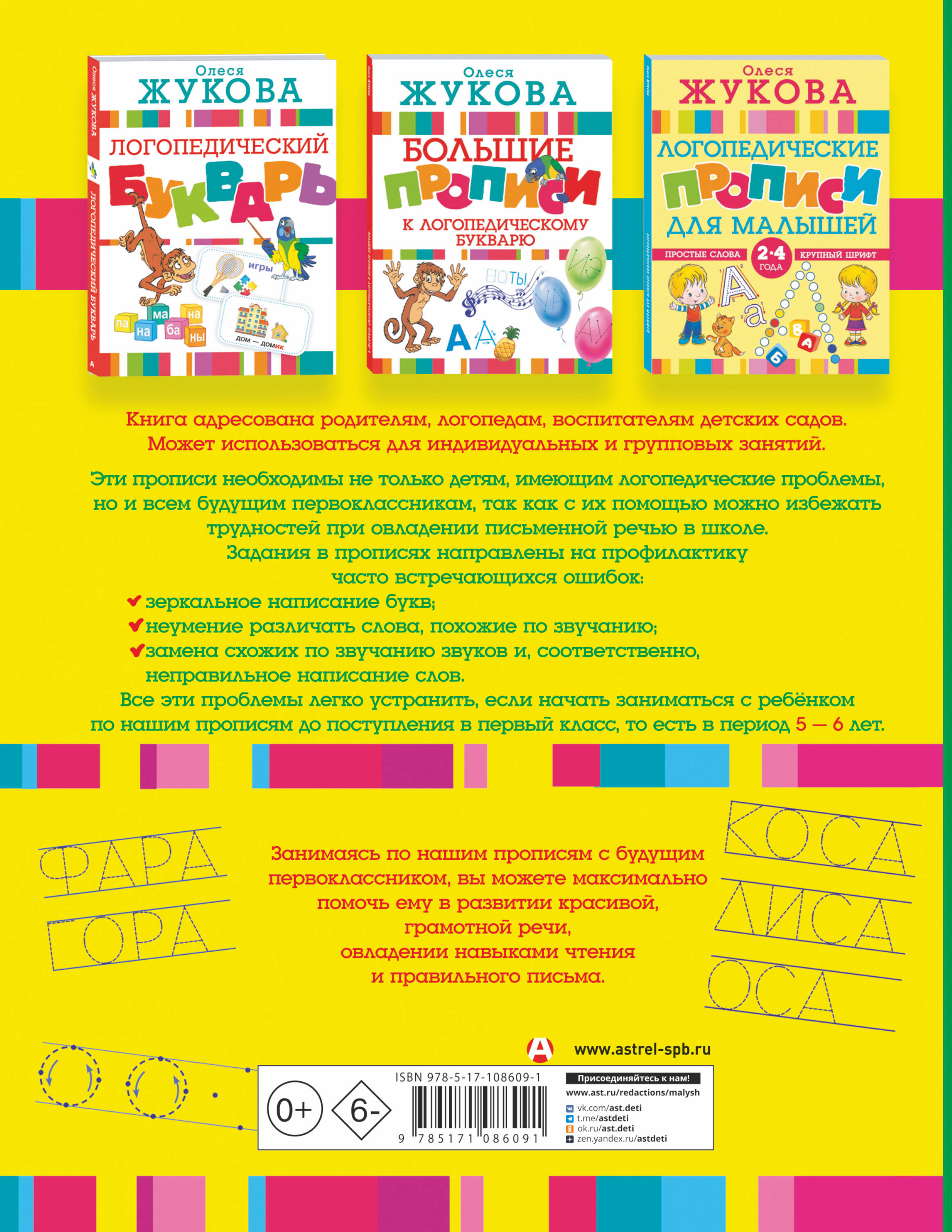Задания в прописях направлены на профилактику часто встречающихся ошибок: зеркальное написание букв (Я–R; Е–Ǝ и т. п.); неумение различать слова, похожие по звучанию (например, сом – том – ком и т. п.); замена схожих по звучанию звуков и, соответственно, неправильное написание слов (например, зайка – сайка; кошка – коска). Все эти проблемы легко устранить, если начать заниматься с ребенком по нашим прописям до поступления в первый класс, то есть в период 5 -6 лет.