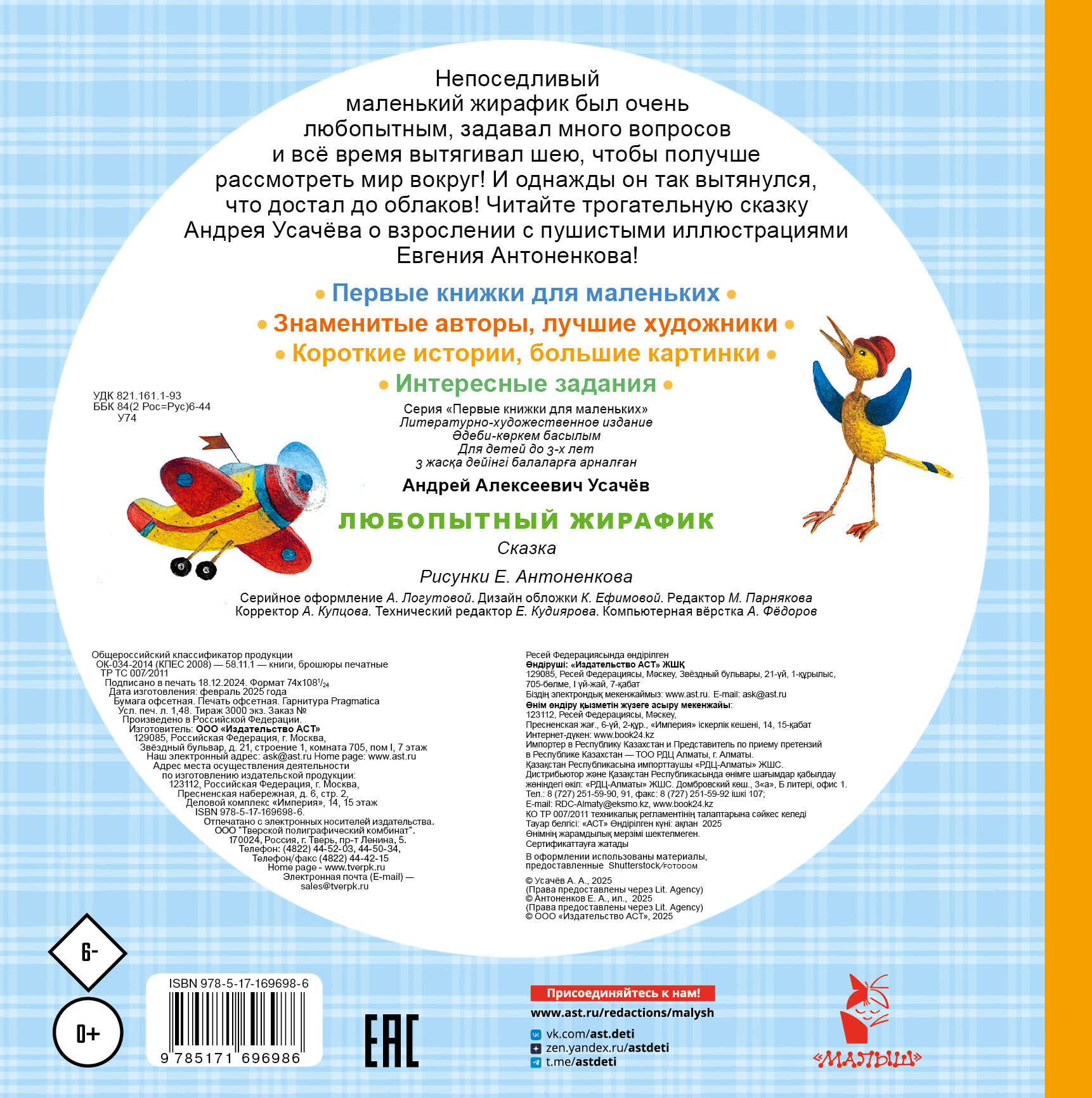 Непоседливый маленький жирафик был очень любопытным, задавал много вопросов и всё время вытягивал шею, чтобы получше рассмотреть мир вокруг! И однажды он так вытянулся, что достал до облаков! Читайте трогательную сказку Андрея Усачёва о взрослении с пушистыми иллюстрациями Евгения Антоненкова!
