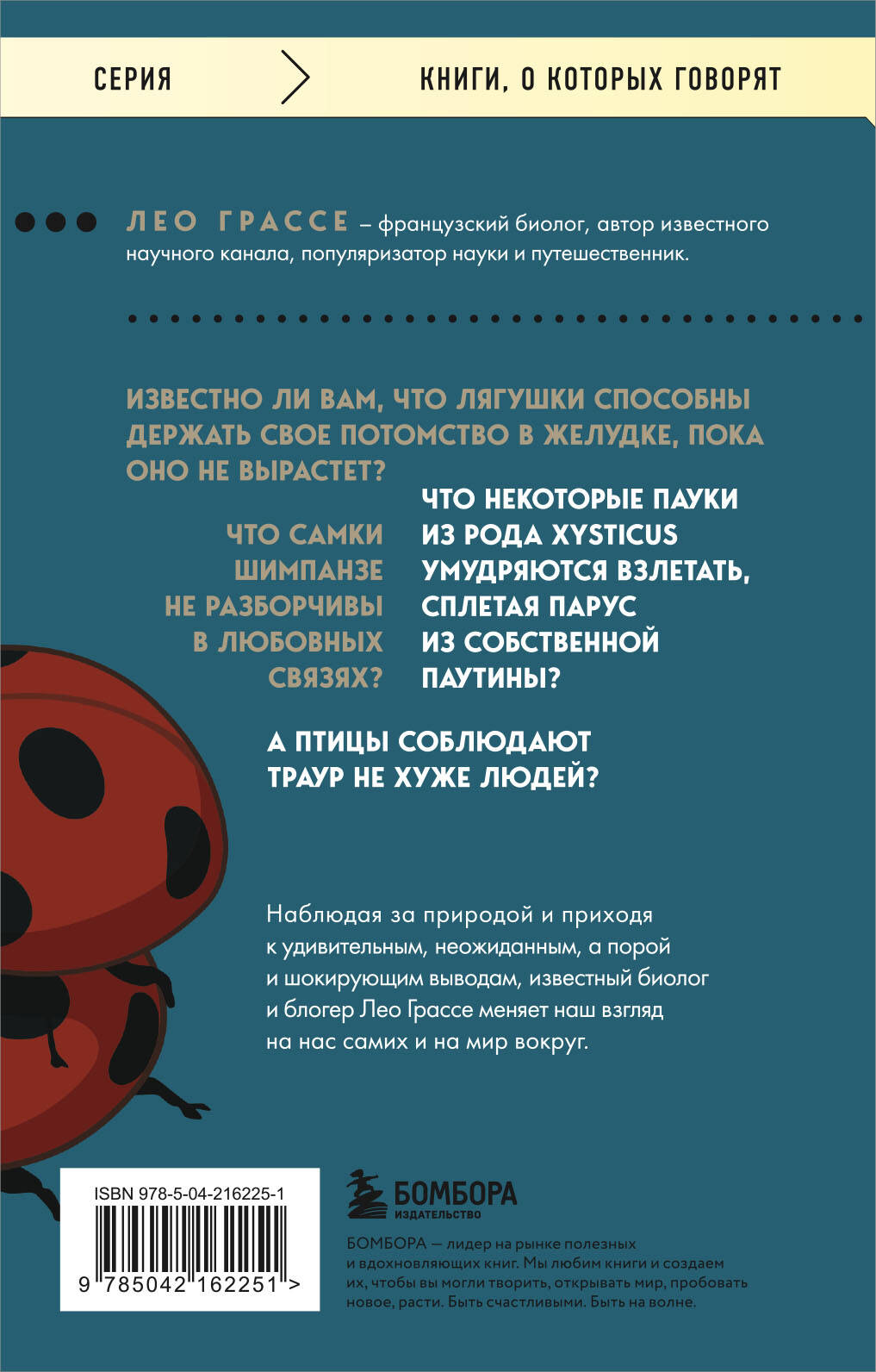 Известно ли вам, что лягушки способны держать свое потомство в желудке, пока оно не вырастет? Что некоторые пауки из рода Xysticus умудряются взлетать, сплетая парус из собственной паутины? Что самки шимпанзе неразборчивы в любовных связях? А птицы соблюдают траур не хуже людей? Наблюдая за природой и приходя к удивительным, неожиданным, а порой и шокирующим выводам, известный биолог и блогер Лео Грассе меняет наш взгляд на нас самих и на мир вокруг.