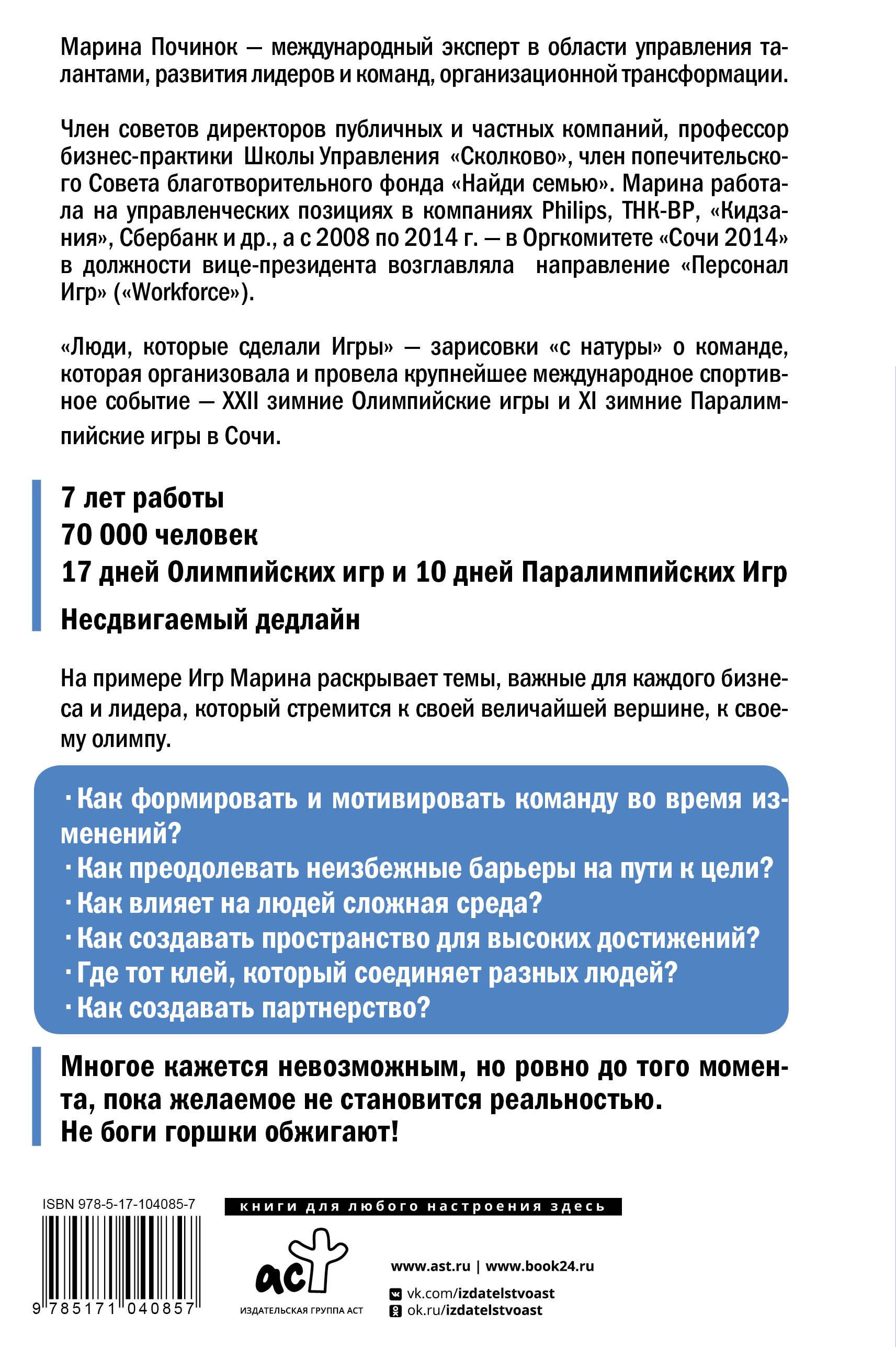 "Люди, которые сделали игры" — зарисовки "c натуры" о команде, которая организовала и провела крупнейшее международное спортивное событие — XXII зимние Олимпийские игры и XI зимние Паралимпийских игры в Сочи. Историю рассказывает руководитель одного из ключевых направлений Оргкомитета Сочи 2014 "Персонал Игр" ("Workforce"). Но перед вами не отчет безупречного лидера. Своим "полевым" опытом управления персоналом сложнейшего проекта в турбулентной среде открыто и эмоционально делится человек, который прошел этот сложный путь вместе с командой.