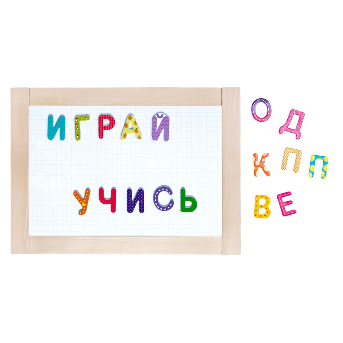 - Он состоит из: двухсторонней доски, а также набора из 50 магнитных букв.