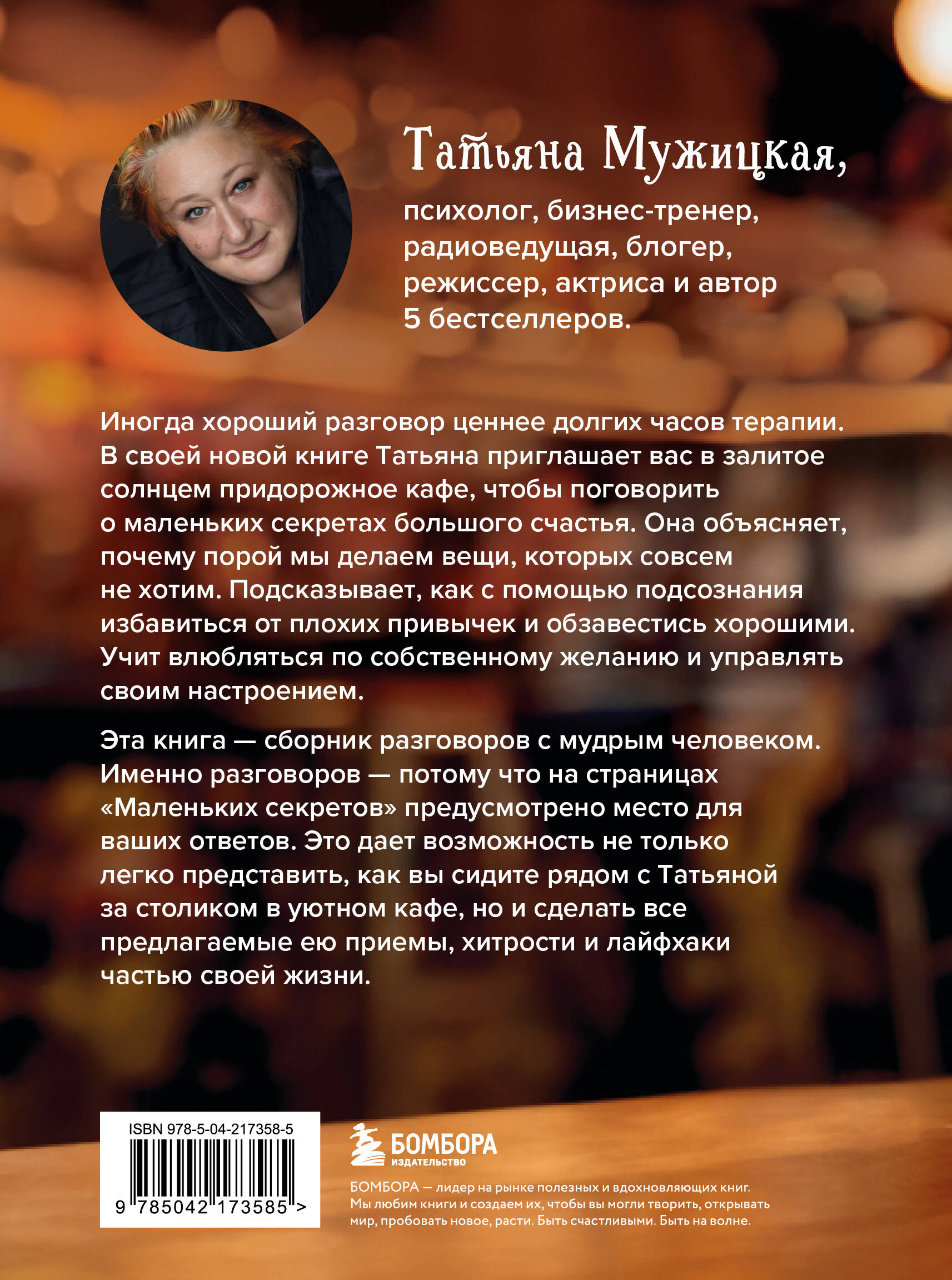 Иногда хороший разговор ценнее долгих часов терапии. В своей новой книге Татьяна приглашает вас в залитое солнцем придорожное кафе, чтобы поговорить о маленьких секретах большого счастья. Она объясняет, почему порой мы делаем вещи, которых совсем не хотим. Подсказывает, как с помощью подсознания избавиться от плохих привычек и обзавестись хорошими. Учит влюбляться по собственному желанию и управлять своим настроением. Эта книга — сборник разговоров с мудрым человеком. Именно разговоров — потому что на страницах «Маленьких секретов» предусмотрено место для ваших ответов. Это дает возможность не только легко представить, как вы сидите рядом с Татьяной за столиком в уютном кафе, но и сделать все предлагаемые ею приемы, хитрости и лайфхаки частью своей жизни.