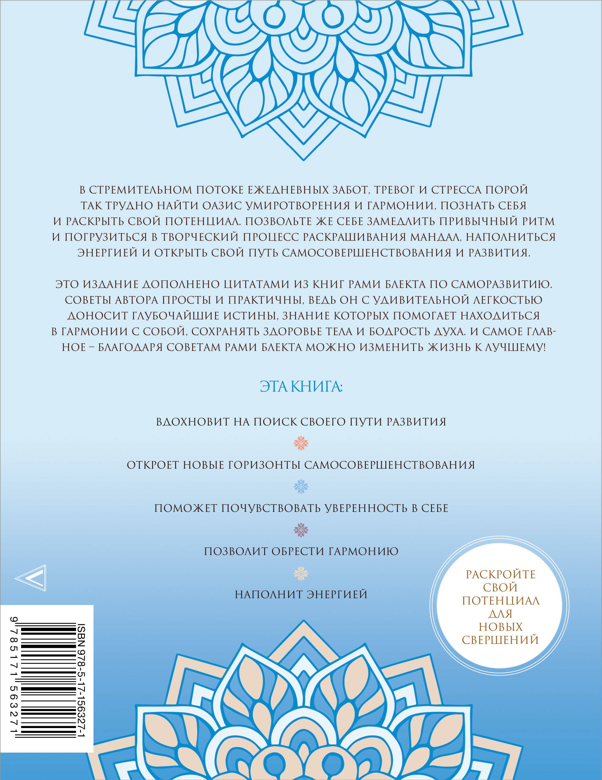 Издание "Мандалы самосовершенствования: твои энергии и пути развития" дополнено цитатами из книг Рами Блекта по саморазвитию, основанных на древней мудрости и современных исследованиях в области психологии и философии. Советы автора просты и практичны, ведь он с удивительной легкостью доносит глубочайшие истины, знание которых помогает находиться в гармонии с собой, сохранять здоровье тела и бодрость духа. И самое главное – благодаря советам Рами Блекта можно изменить жизнь к лучшему! Раскройте свой потенциал для новых свершений!