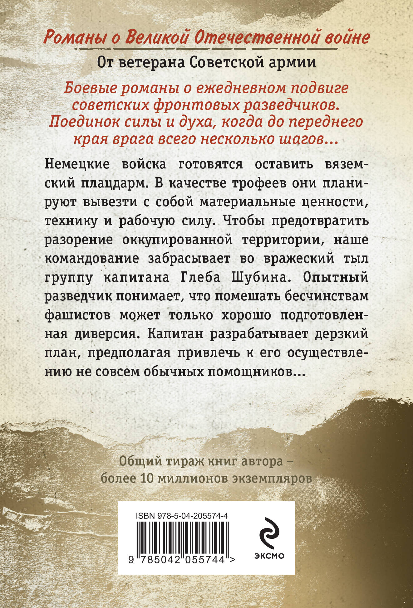 Немецкие войска готовятся оставить вяземский плацдарм. В качестве трофеев они планируют вывезти с собой материальные ценности, технику и рабочую силу. Чтобы предотвратить разорение оккупированной территории, наше командование забрасывает во вражеский тыл группу капитана Глеба Шубина. Опытный разведчик понимает, что помешать бесчинствам фашистов может только хорошо подготовленная диверсия. Капитан разрабатывает дерзкий план, предполагая привлечь к его осуществлению не совсем обычных помощников…
