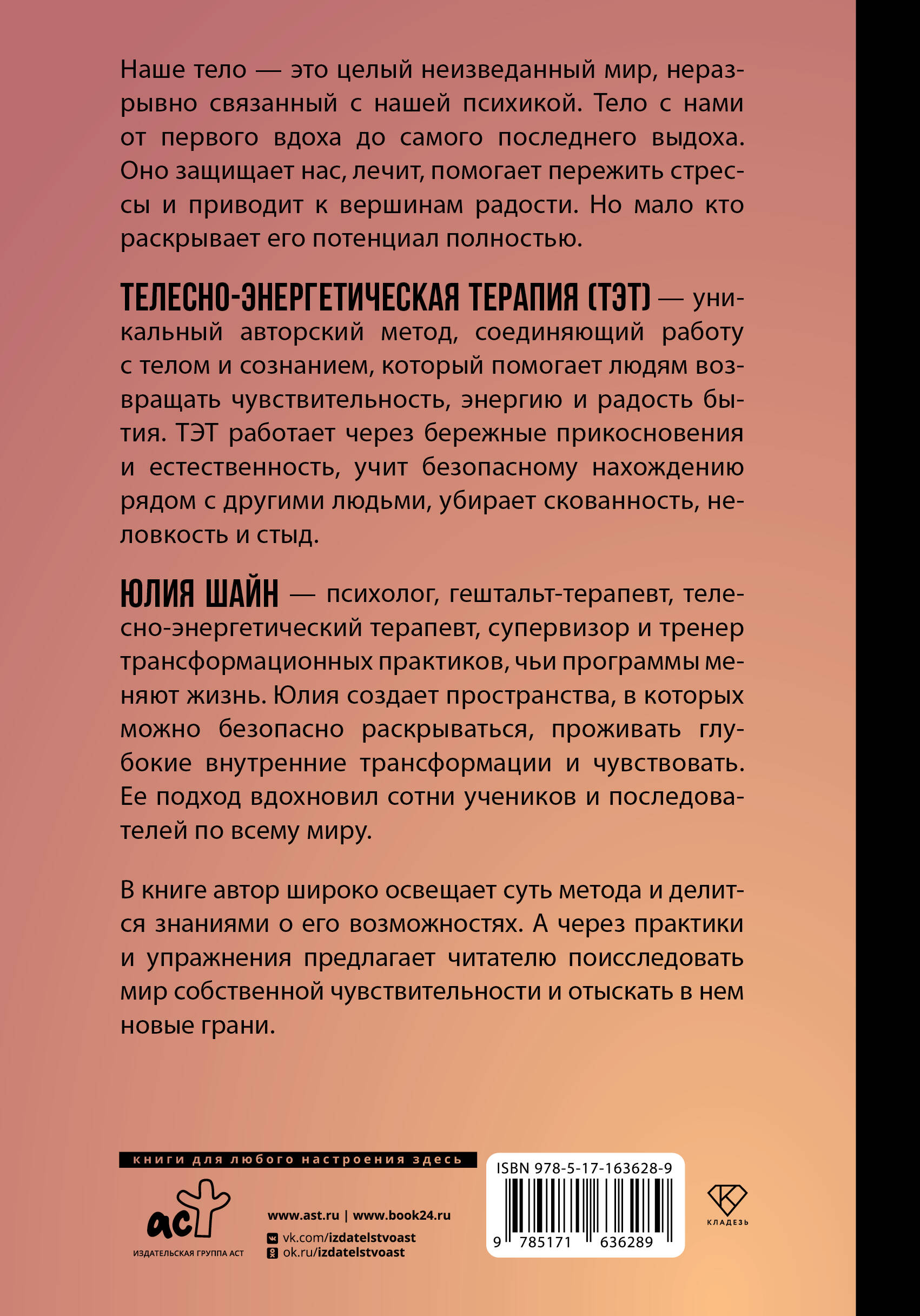 Телесно-энергетическая терапия (ТЭТ) — уникальный авторский метод, соединяющий работу с телом и сознанием, который помогает людям возвращать чувствительность, энергию и радость бытия. ТЭТ работает через бережные прикосновения и естественность, учит безопасному нахождению рядом с другими людьми, убирает скованность, неловкость и стыд.