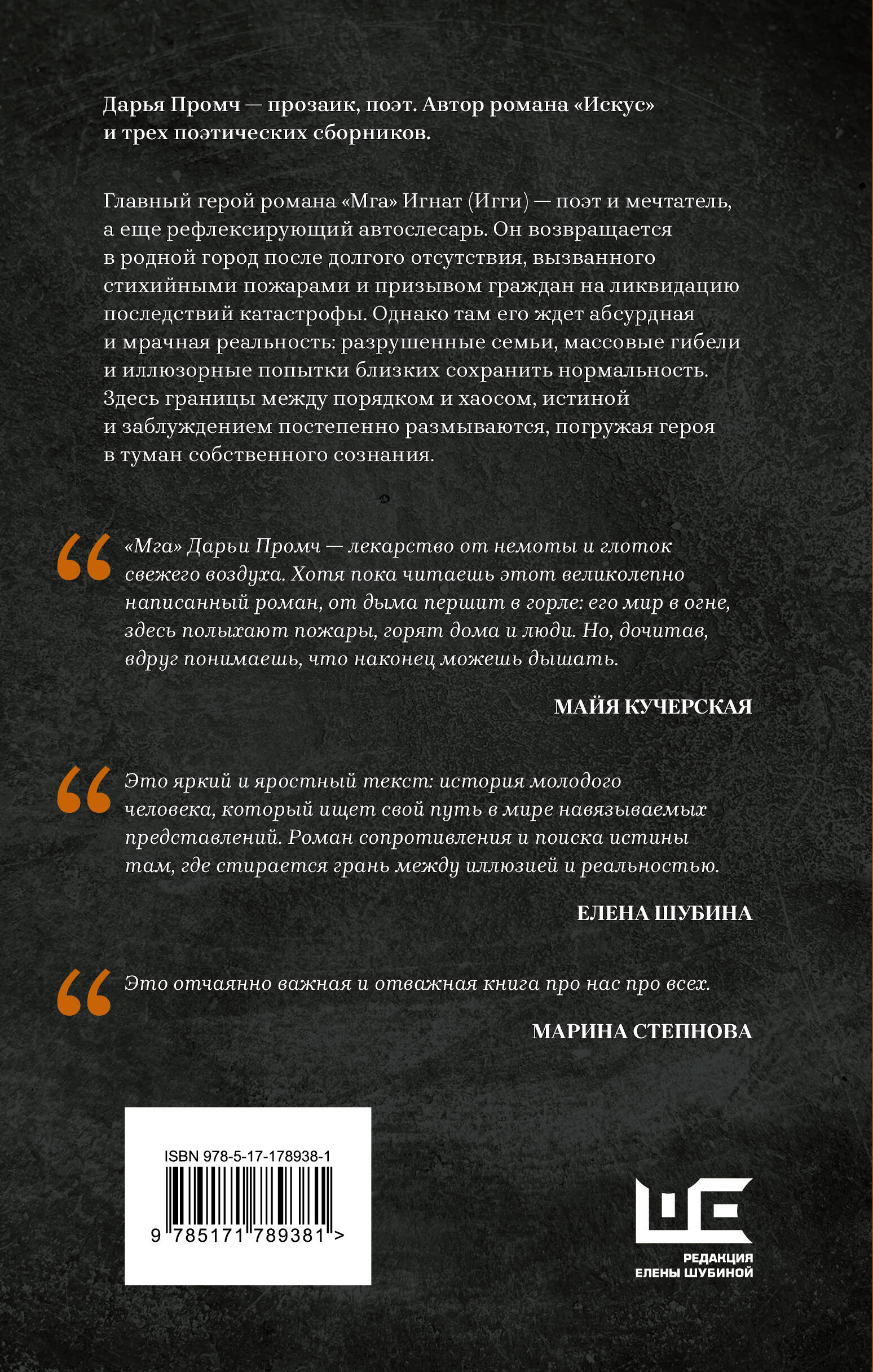 ""Мга" Дарьи Промч — лекарство от немоты и глоток свежего воздуха. Хотя пока читаешь этот великолепно написанный роман, от дыма першит в горле: его мир в огне, здесь полыхают пожары, горят дома и люди. Но, дочитав, вдруг понимаешь, что наконец можешь дышать (МАЙЯ КУЧЕРСКАЯ)".