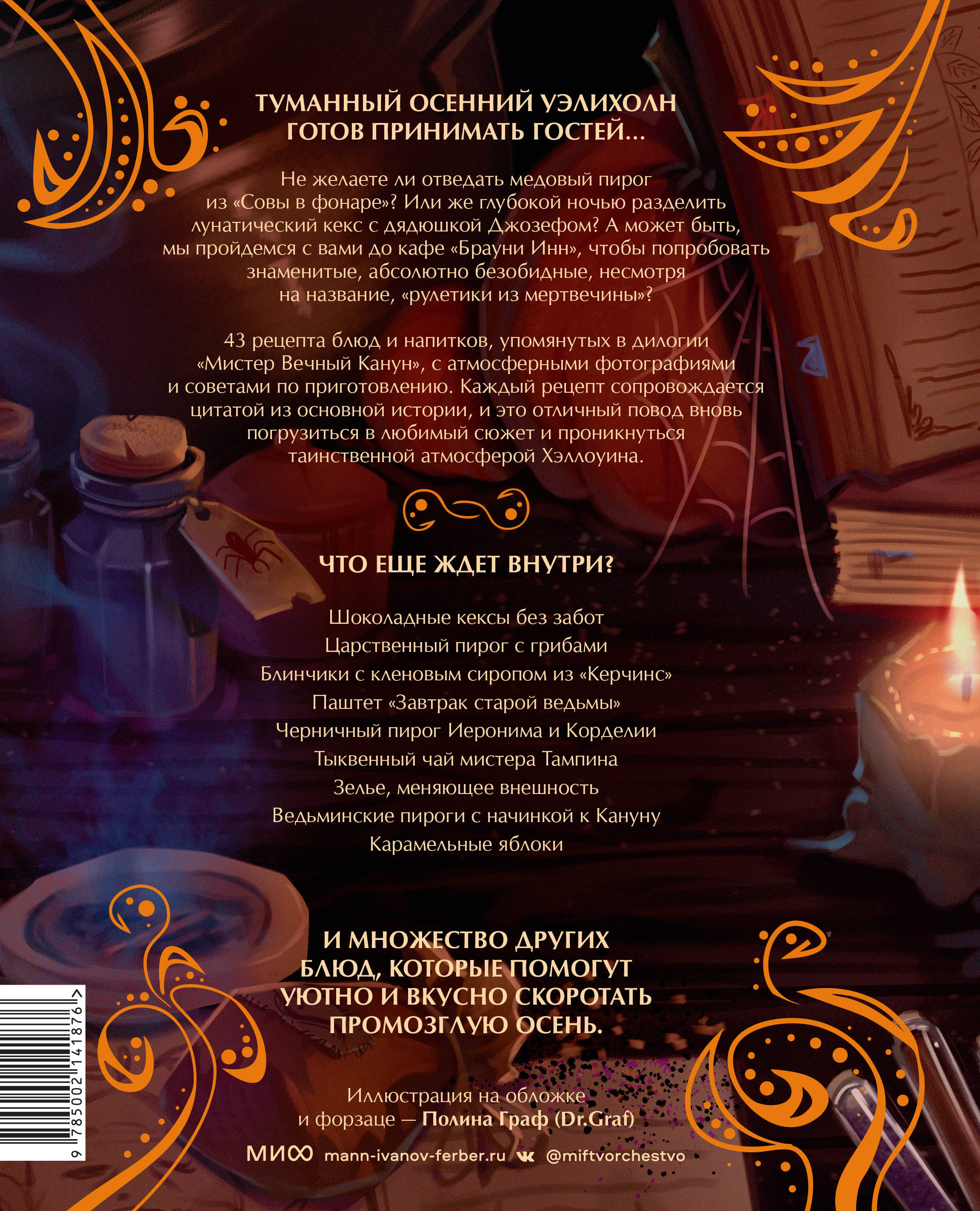 43 рецепта блюд и напитков, упомянутых в дилогии "Мистер Вечный Канун", с атмосферными фотографиями и советами по приготовлению. Каждый рецепт сопровождается цитатой из основной истории, и это отличный повод снова погрузиться в любимый сюжет и проникнуться таинственной атмосферой Хэллоуина.