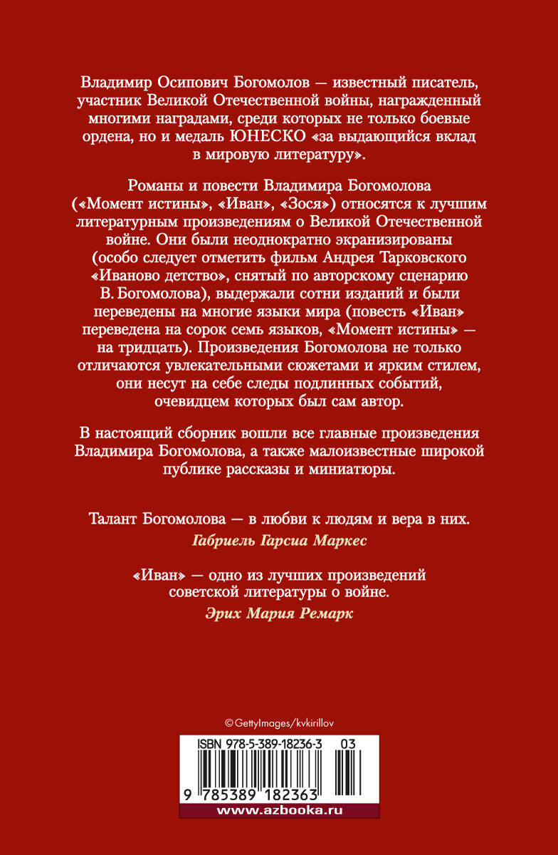 Владимир Осипович Богомолов — известный писатель, участник Великой Отечественной войны, награжденный многими наградами, среди которых не только боевые ордена, но и медаль ЮНЕСКО "за выдающийся вклад в мировую литературу". Романы и повести Владимира Богомолова ("Момент истины", "Иван", "Зося") относятся к лучшим литературным произведениям о Великой Отечественной войне. Они были неоднократно экранизированы (особо следует отметить фильм Андрея Тарковского "Иваново детство", снятый по авторскому сценарию В. Богомолова), выдержали сотни изданий и были переведены на многие языки мира (повесть "Иван" переведена на сорок семь языков, "Момент истины" — на тридцать). Произведения В. Богомолова не только отличаются увлекательными сюжетами и ярким стилем, они несут на себе следы подлинных событий, очевидцем которых был сам автор. В настоящий сборник вошли все главные произведения Владимира Богомолова, а также малоизвестные широкой публике рассказы и миниатюры.