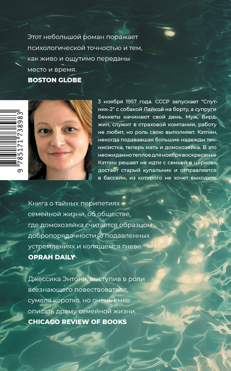 – Действие этого камерного романа разворачиваются в течение одного дня. Однажды теплым ноябрьским утром Кэтлин, некогда подающая надежды теннисистка, а теперь мать и домохозяйка, отменяет все дела и идет в бассейн, из которого отказывается выходить до самого вечера.