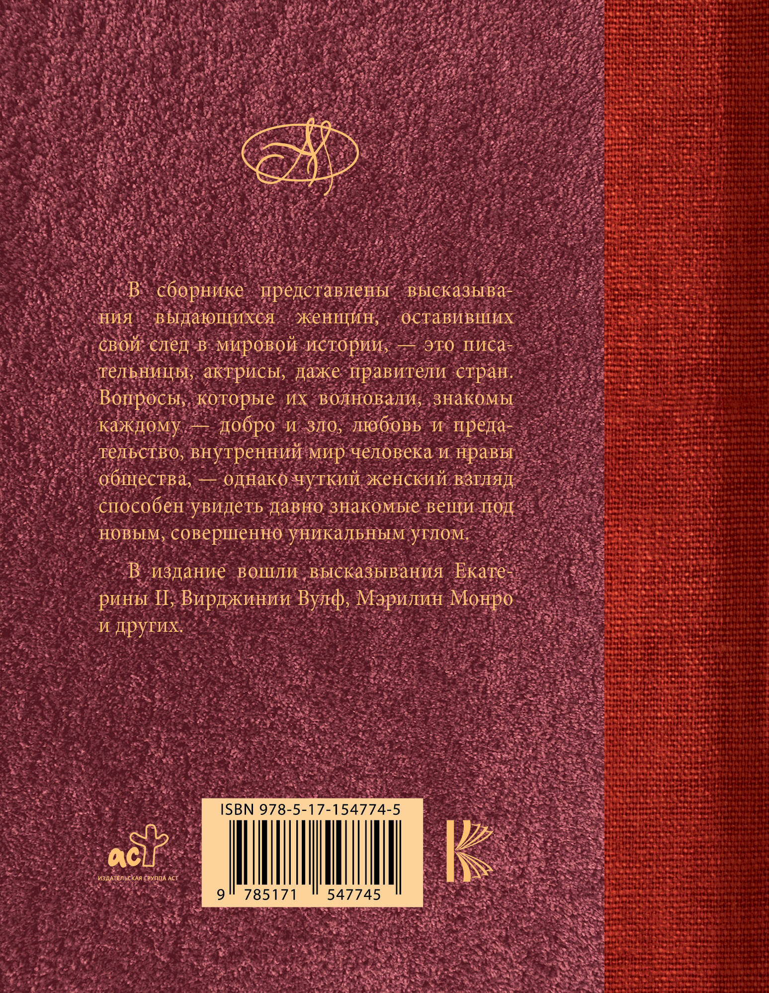 В сборнике представлены высказывания выдающихся женщин, оставивших свой след в мировой истории - это писательницы, актрисы, даже правители стран. Вопросы, которые их волнуют, знакомы каждому - добро и зло, любовь и предательство, внутренний мир человека и нравы общества, - однако чуткий женский взгляд способен увидеть давно знакомые вещи под новым, совершенно уникальным углом.