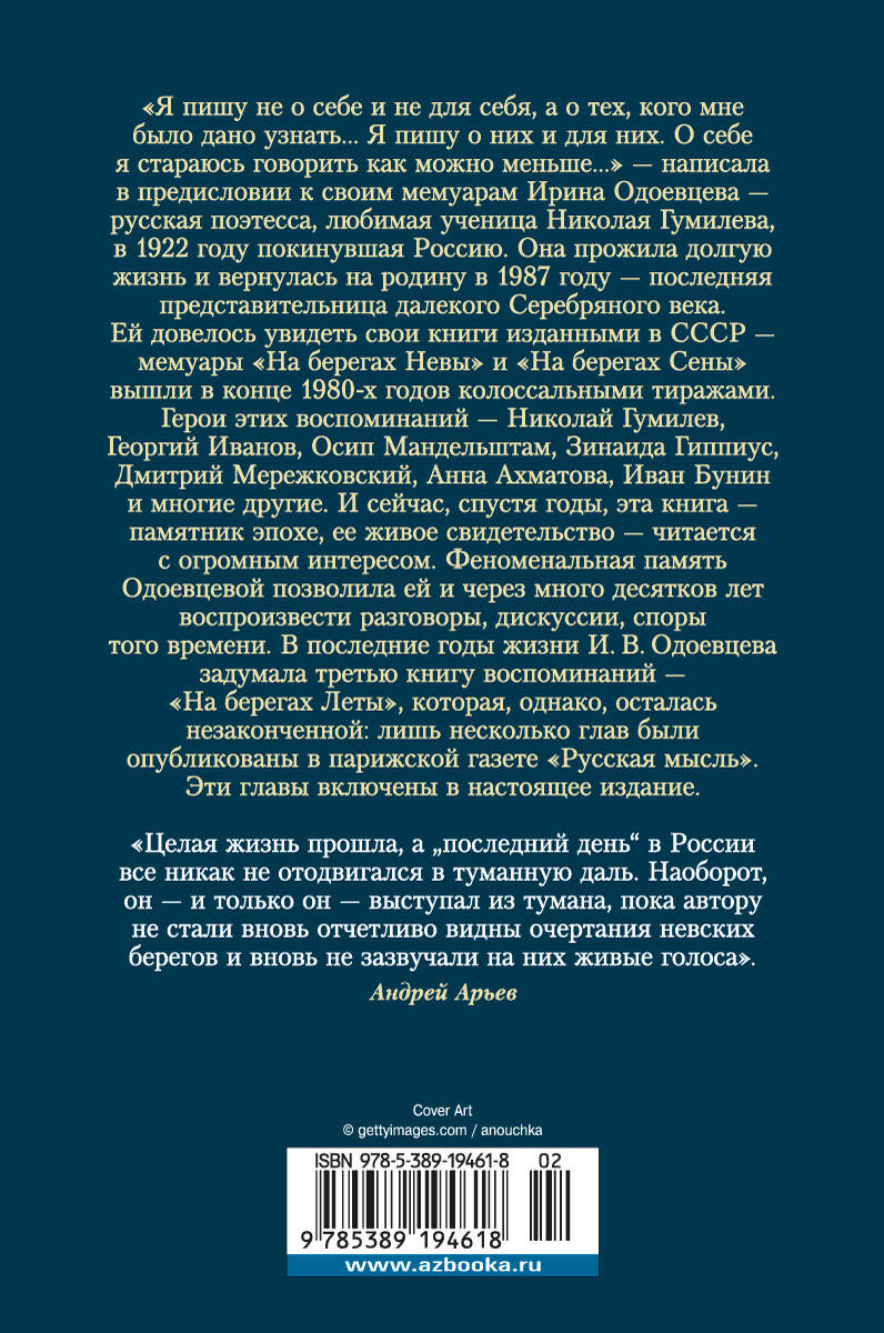 "Я пишу не о себе и не для себя, а о тех, кого мне было дано узнать… Я пишу о них и для них. О себе я стараюсь говорить как можно меньше…" — написала в предисловии к своим мемуарам Ирина Одоевцева — русская поэтесса, любимая ученица Николая Гумилева, в 1922 году покинувшая Россию. Она прожила долгую жизнь и вернулась на родину в 1987 году — последняя представительница далекого Cеребряного века. Ей довелось увидеть свои книги изданными в СССР — мемуары "На берегах Невы" и "На берегах Сены" вышли в конце 1980-х годов колоссальными тиражами. Герои этих воспоминаний — Николай Гумилев, Георгий Иванов, Осип Мандельштам, Зинаида Гиппиус, Дмитрий Мережковский, Анна Ахматова, Иван Бунин и многие другие. И сейчас, спустя годы, эта книга — памятник эпохе, ее живое свидетельство — читается с огромным интересом. Феноменальная память Одоевцевой позволила ей и через много десятков лет воспроизвести разговоры, дискуссии, споры того времени. В последние годы жизни И. В. Одоевцева задумала третью книгу воспоминаний — "На берегах Леты", которая, однако, осталась незаконченной: лишь несколько глав были опубликованы в парижской газете "Русская мысль". Эти главы включены в настоящее издание.