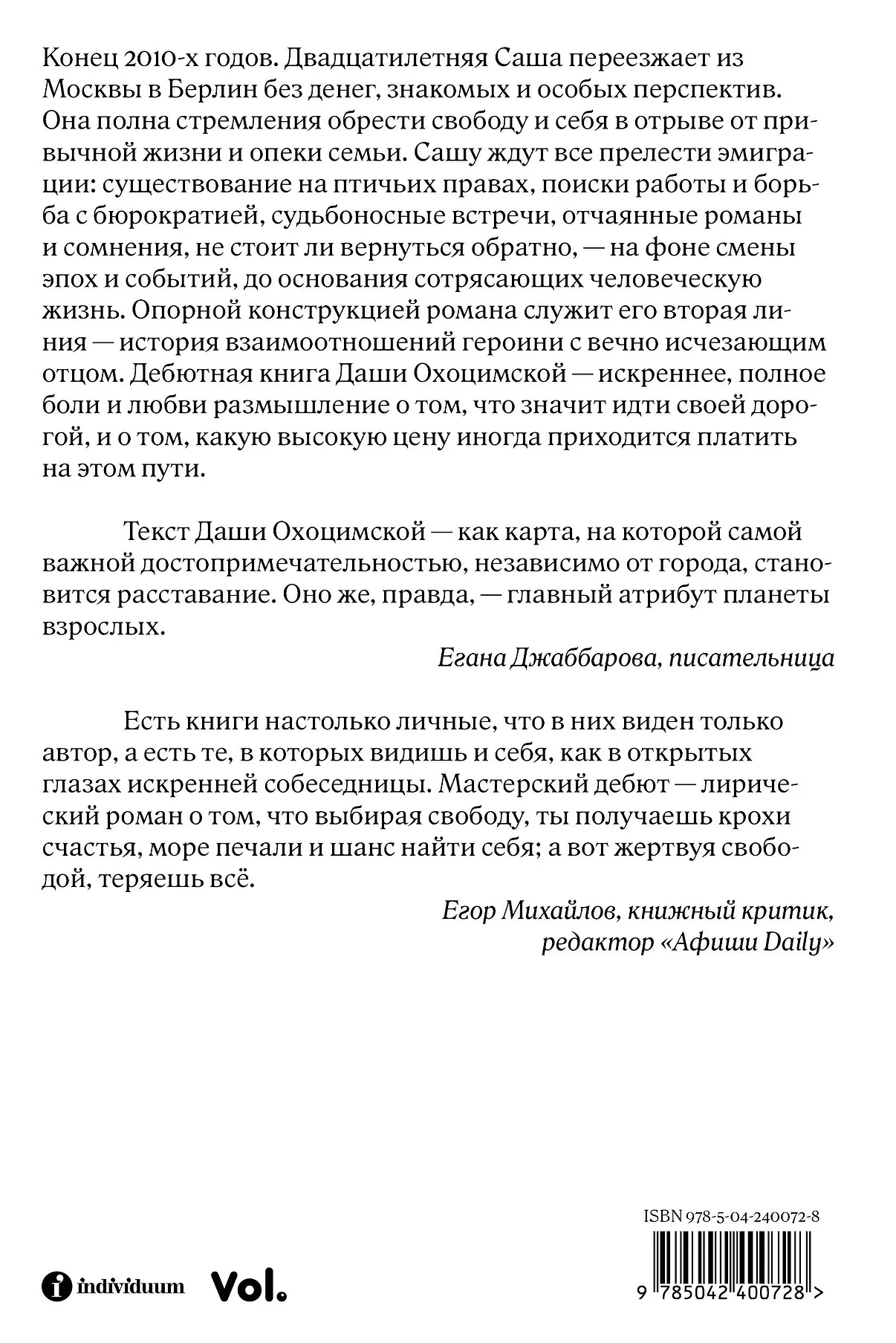 Конец 2010‑х годов. Двадцатилетняя Саша переезжает из Москвы в Берлин без денег, знакомых и особых перспектив. Она полна стремления обрести свободу и себя в отрыве от привычной жизни и опеки семьи. Сашу ждут все прелести эмиграции: существование на птичьих правах, поиски работы и борьба с бюрократией, судьбоносные встречи, отчаянные романы и сомнения, не стоит ли вернуться обратно, — на фоне смены эпох и событий, до основания сотрясающих человеческую жизнь. Опорной конструкцией романа служит его вторая линия — история взаимоотношений героини с вечно исчезающим отцом. Дебютная книга Даши Охоцимской — искреннее, полное боли и любви размышление о том, что значит идти своей дорогой, и о том, какую высокую цену иногда приходится платить на этом пути.
