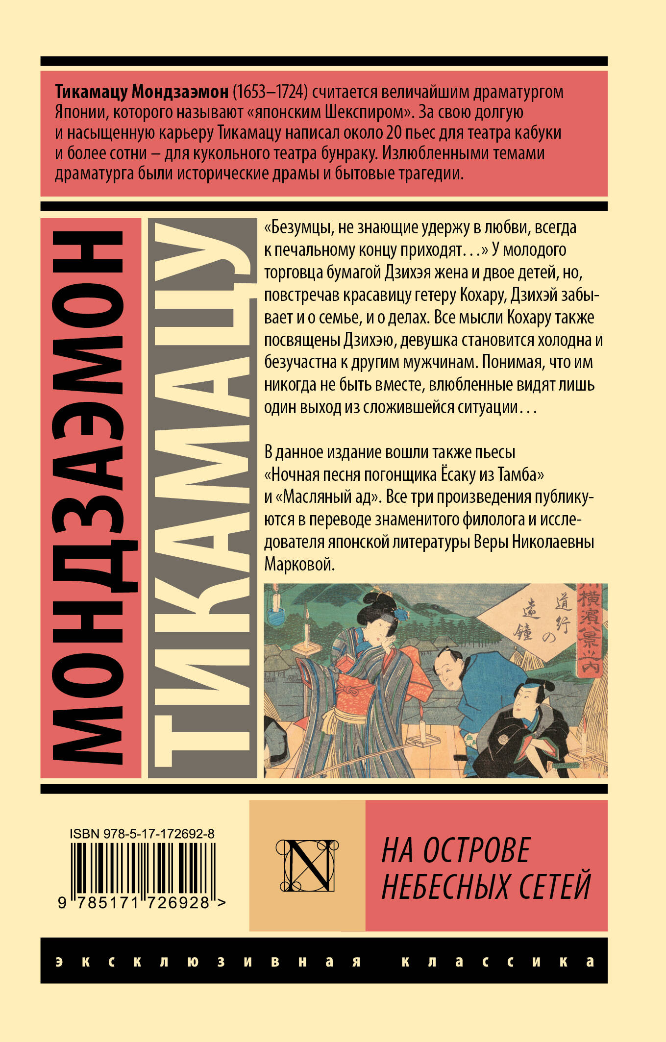 — В данное издание вошли три классические пьесы Тикамацу — «На Острове Небесных Сетей», «Ночная песня погонщика Ёсаку из Тамба» и «Масляный ад».