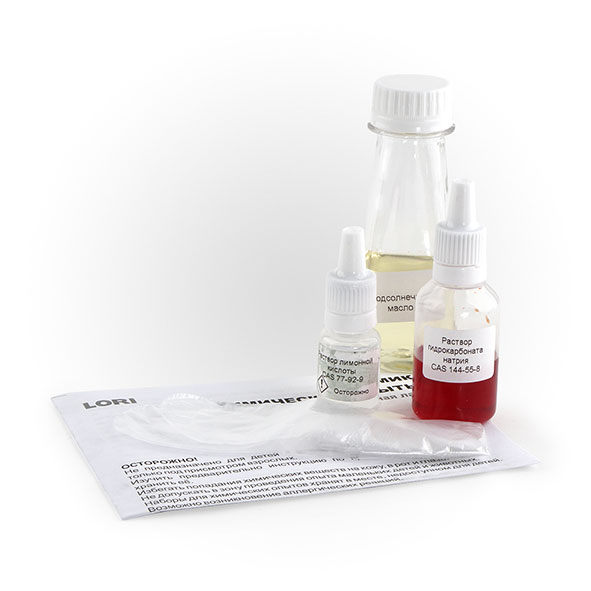 В наборе: химические реактивы, подсолнечное масло, перчатки, инструкция.
