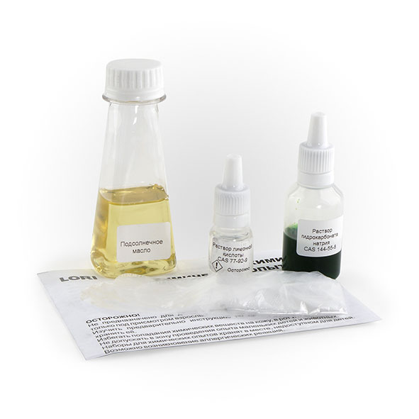Комплектация: Подсолнечное масло, раствор лимонной кислоты, раствор гидрокарбоната натрия с красителем, перчатки, инструкция.