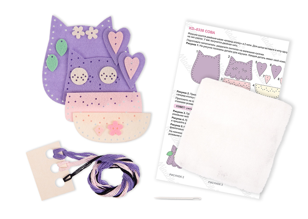 В набор входят все необходимые материалы для изготовления игрушки: детали из фетра с перфорацией, безопасная пластиковая игла, нитки, синтепон, подробная инструкция с картинками.