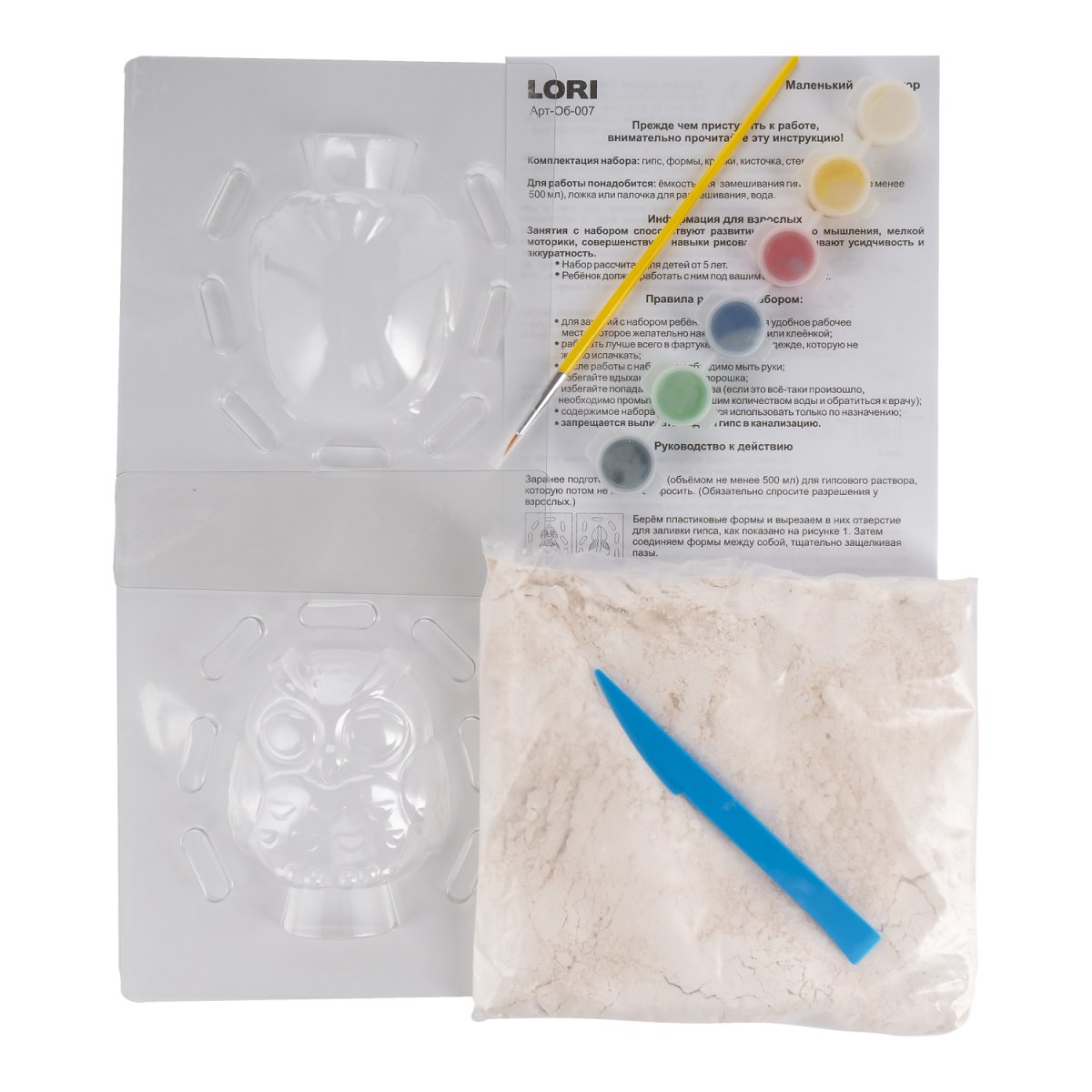Комплектация: формы 2шт, гипс 400 г, гуашь 6 цветов по 3 мл, кисть 1-128мм, нож пластиковый, инструкция