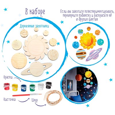 Раскрасьте деревянные детали с двух сторон и соедините их друг с другом с помощью шнурка. Образец раскрашивания есть на коробке. Повесьте украшение над столом или рядом с кроватью. Теперь можно рассказать ребёнку о каждой планете, её расположении и размере.