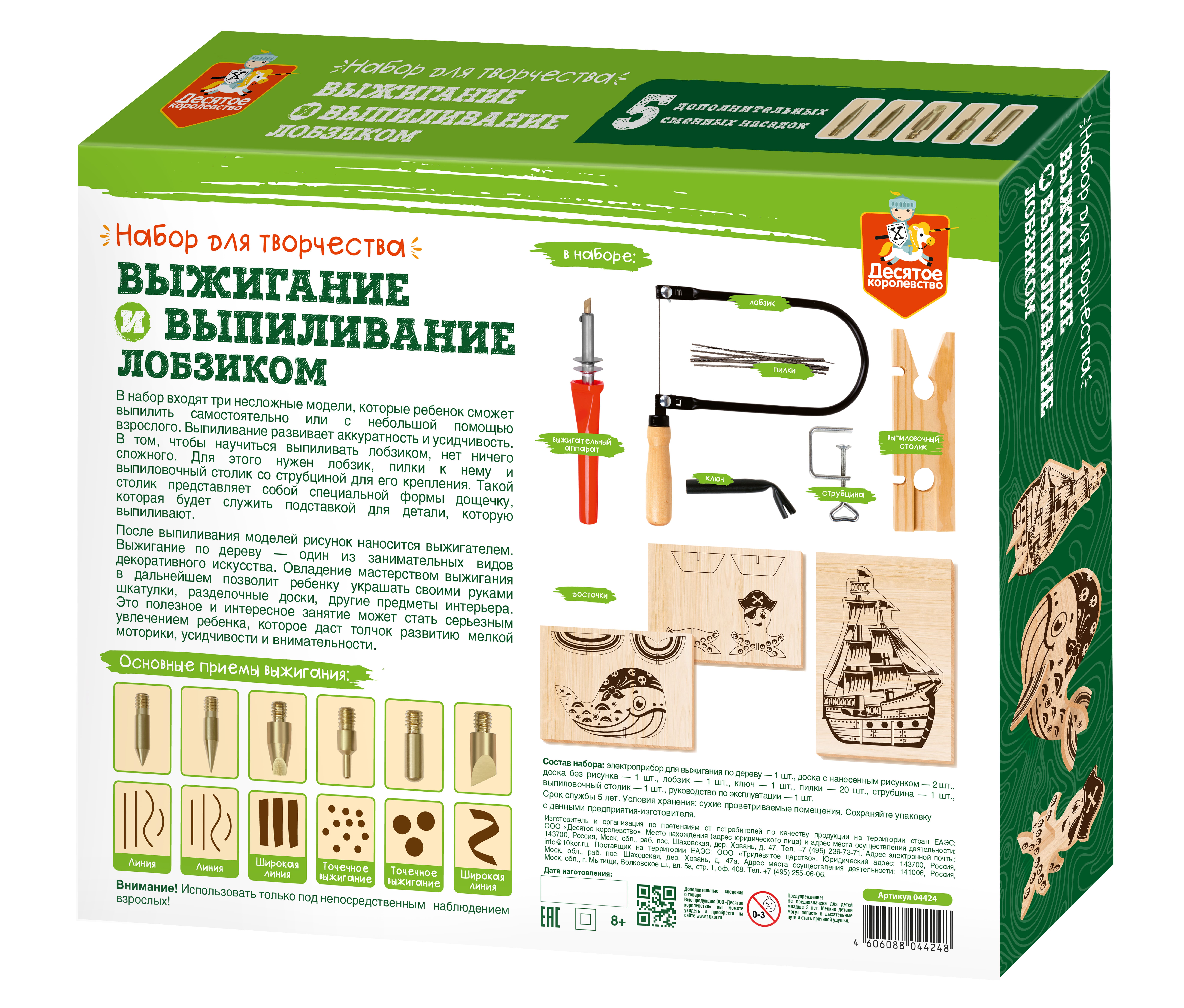 Перед Вами набор, включающий в себя сразу 2 направления деятельности: выпиливание и выжигание по дереву.