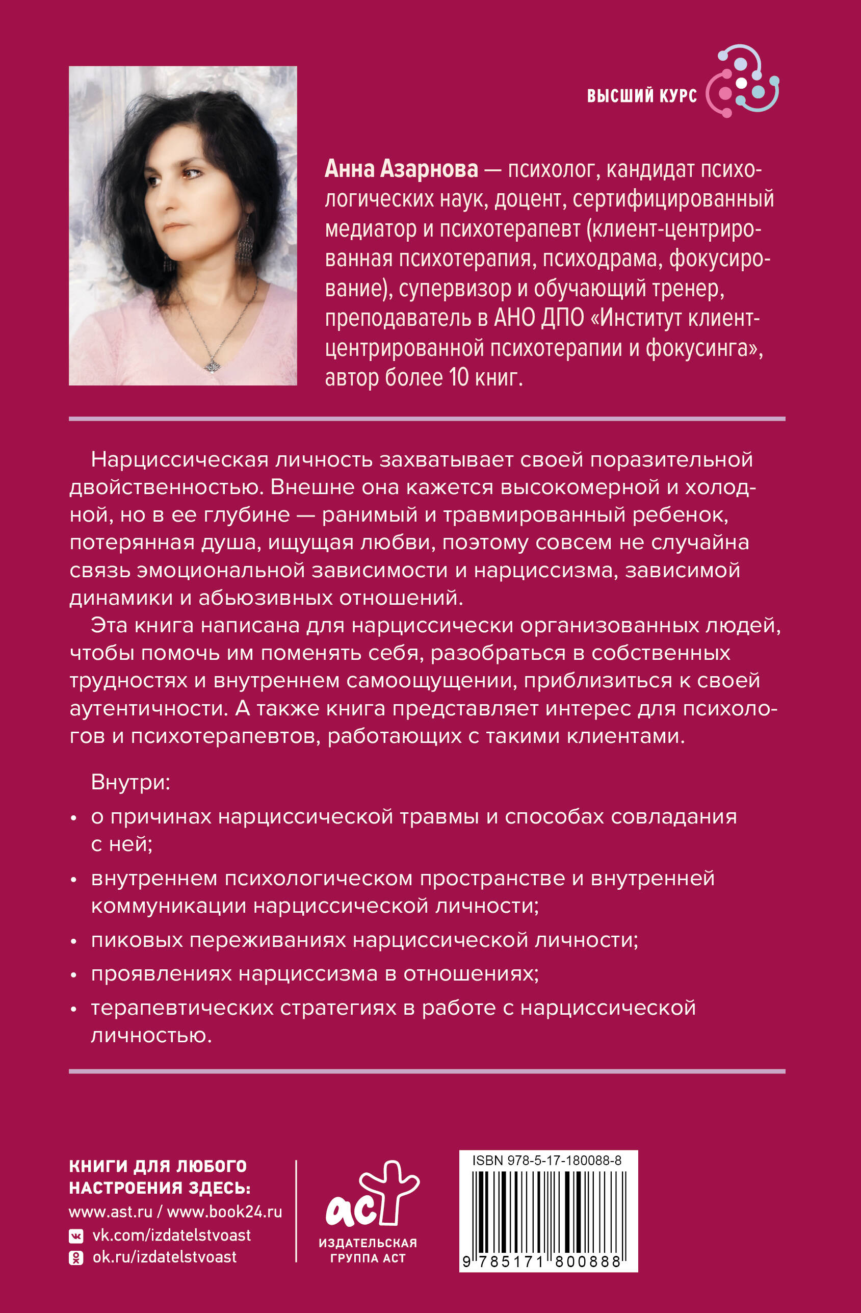Эта книга написана для нарциссически организованных людей, чтобы помочь им поменять себя, разобраться в собственных трудностях и внутреннем самоощущении, приблизиться к своей аутентичности. А также книга представляет интерес для психологов и психотерапевтов, работающих с такими клиентами.