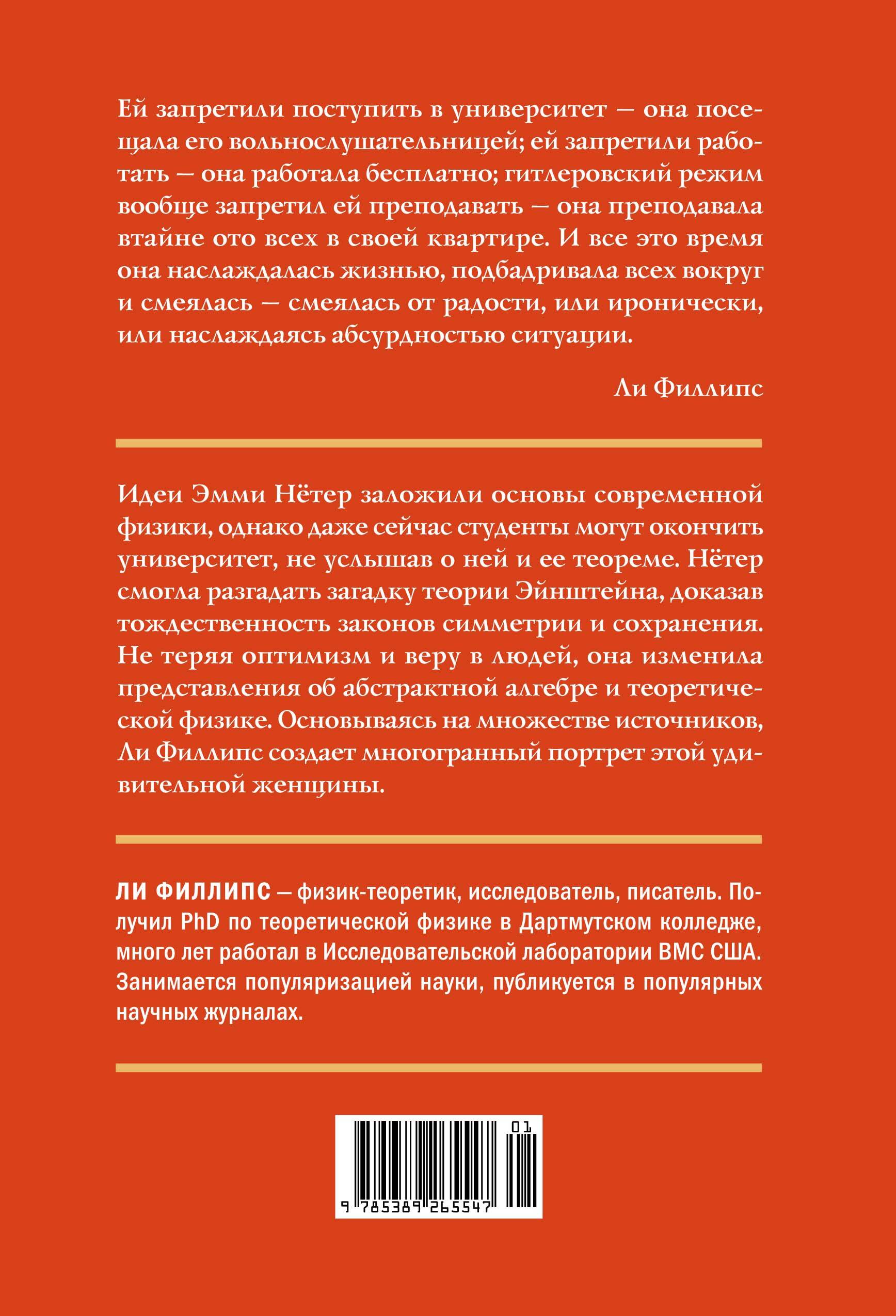 Идеи Эмми Нётер заложили основы современной физики, однако даже сейчас студенты могут окончить университет, не услышав о ней и ее теореме. Нётер смогла разгадать загадку теории Эйнштейна, доказав тождественность законов симметрии и сохранения. Не теряя оптимизм и веру в людей, она изменила представления об абстрактной алгебре и теоретической физике. Основываясь на множестве источников, Ли Филлипс создает многогранный портрет этой удивительной женщины.
