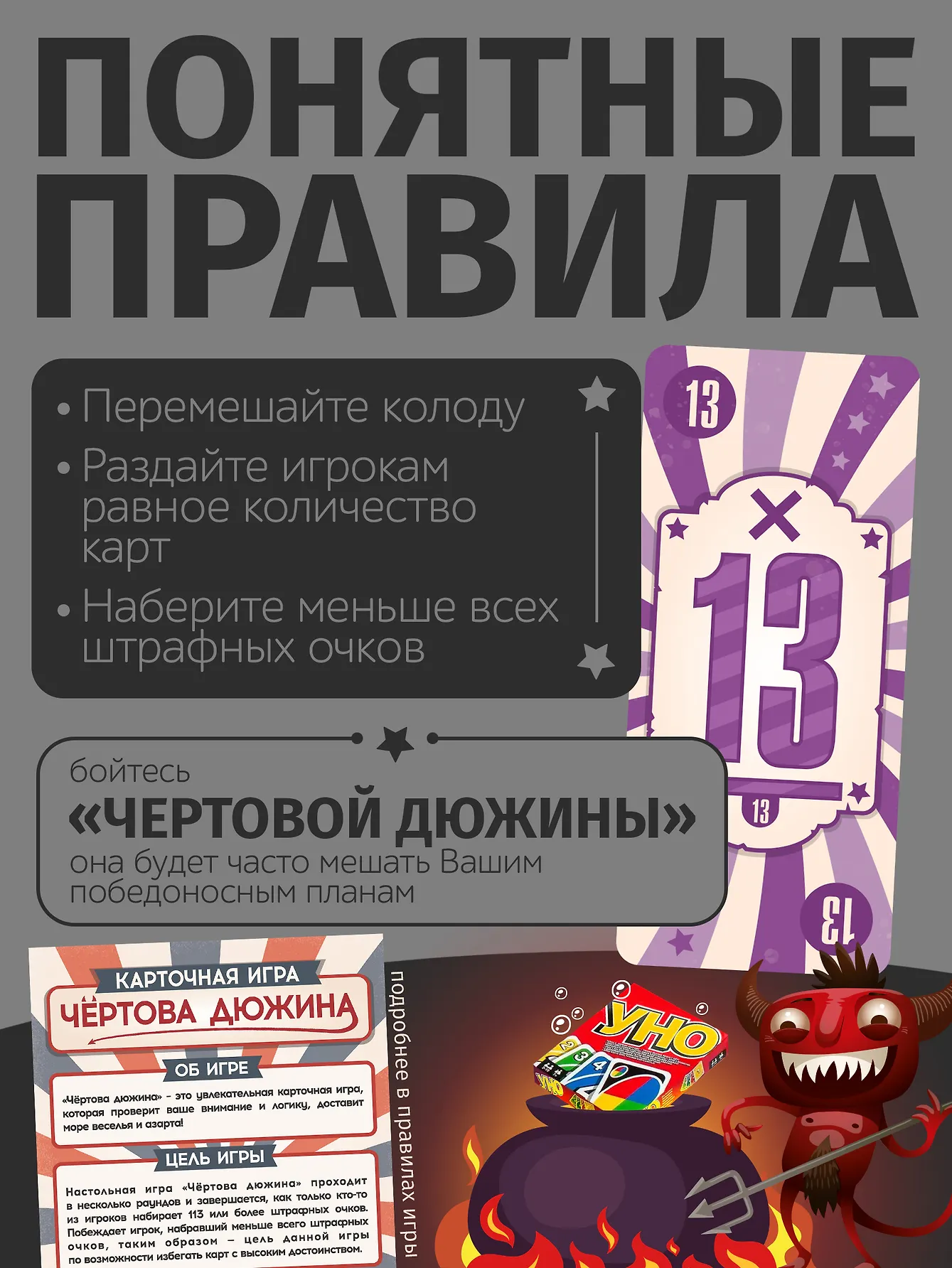 Подарите своей семье и друзьям яркие эмоции и увлекательные минуты с «Чёртовой дюжиной» – идеальной игрой для любой компании и любого настроения!