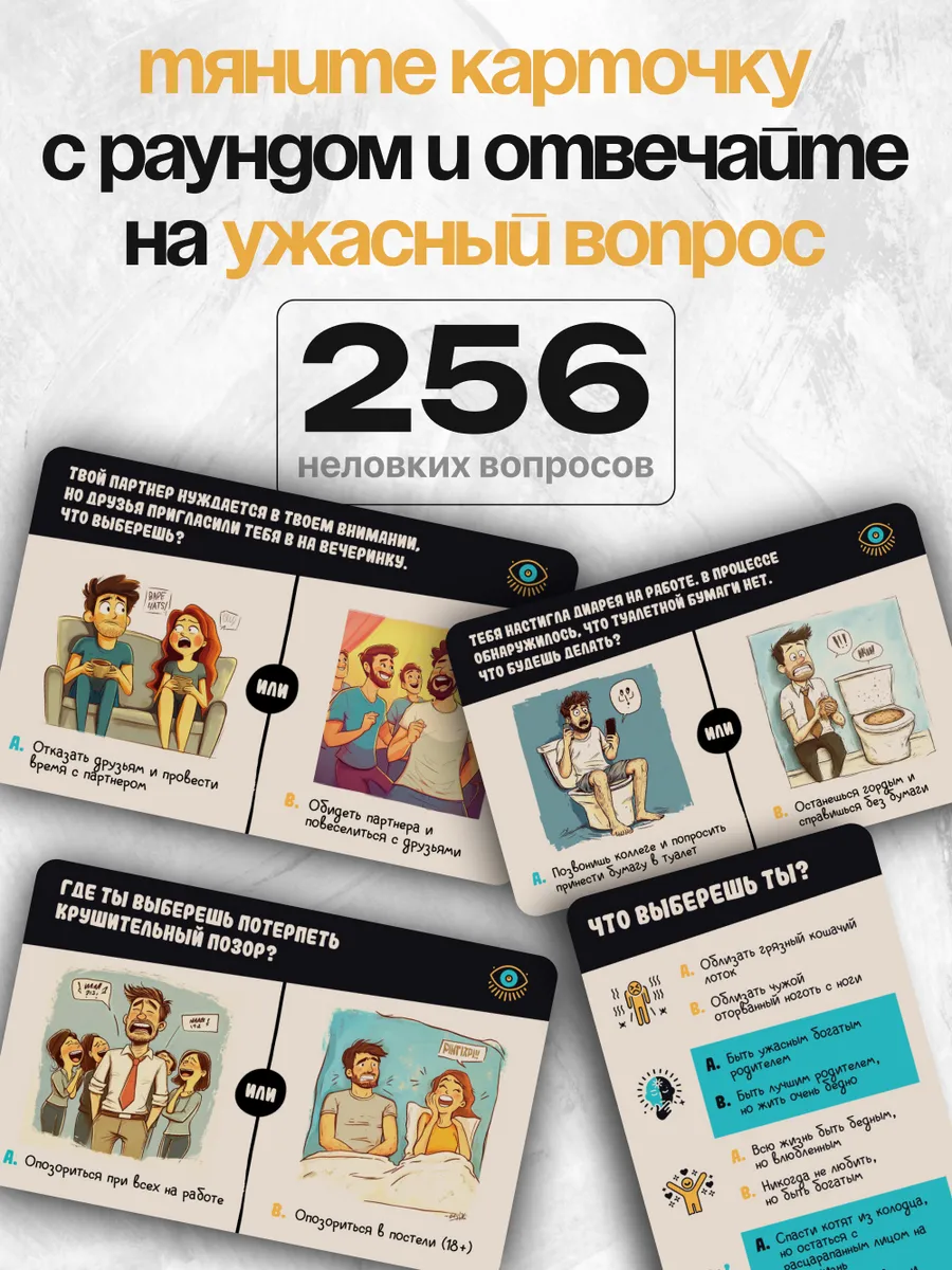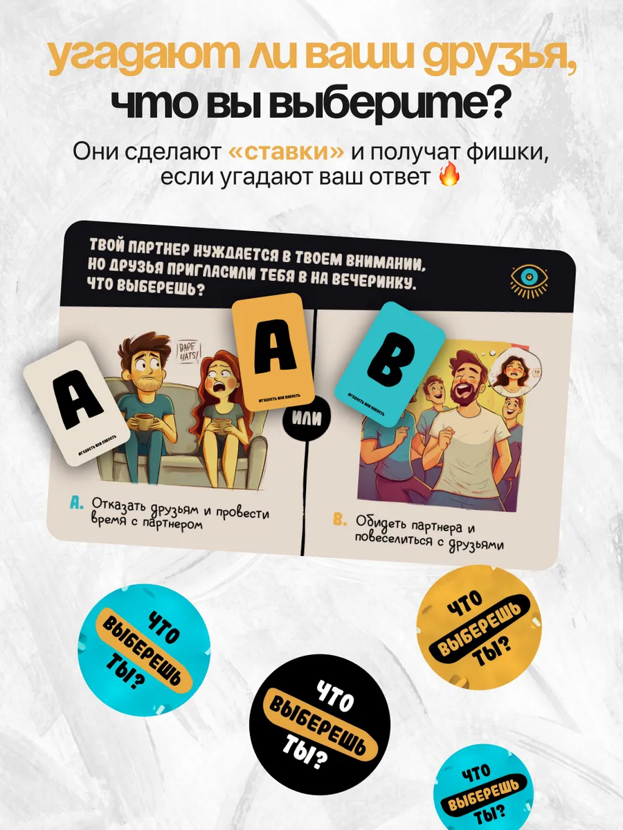 Гадость или Пакость" — это веселая и провокационная настольная игра, которая заставит вас смеяться, краснеть и удивляться! Идеально подходит для компании друзей, готовых к неловким ситуациям и искрометному юмору.Как играть?Каждый раунд начинается с того, что игрок тянет карту с неудобным или забавным вопросом. Например: "Что бы вы предпочли: никогда не мыться или носить одну и ту же одежду год?" Игрок выбирает один из предложенных ответов, а остальные участники должны угадать, какой вариант он выбрал. Игроки ставят свои фишки на предполагаемый ответ. Если кто-то угадывает правильно, он забирает фишки тех, кто ошибся. Если же никто не угадал, фишки достаются игроку, который выбирал ответ. Что делает игру особенной?- 112 карточек с неловкими, смешными и порой абсурдными вопросами, которые гарантируют взрывы смеха и неожиданные откровения. - 75 фишек для ставок, которые добавляют азарта и динамики в игру. - Простые правила, которые позволяют начать играть буквально за минуту. - Идеально для вечеринок, семейных посиделок или любого случая, когда нужно разрядить обстановку.