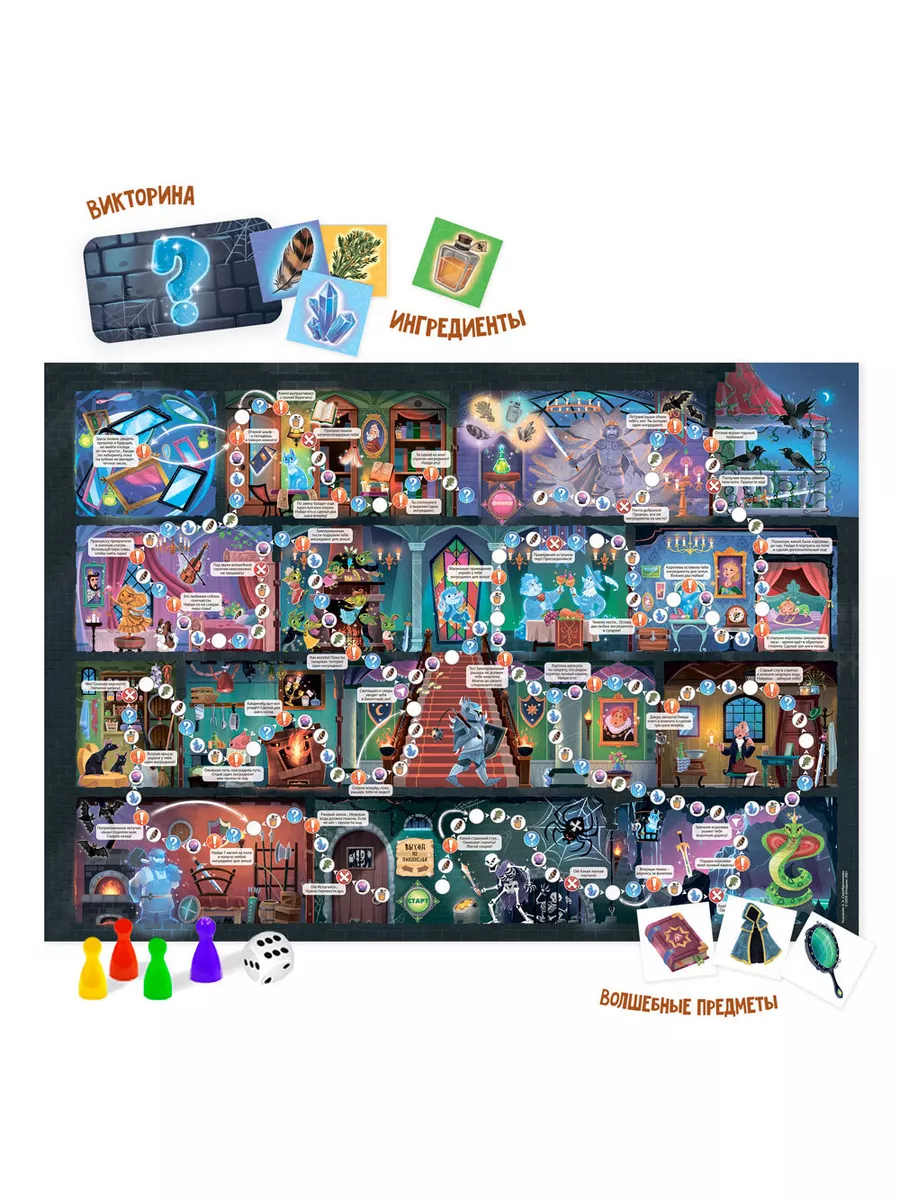 Игра-ходилка с викториной «Заколдованный замок»- это увлекательное приключение в мир волшебства! Здесь героев ждут подземелья, призраки и заколдованные обитатели замка! Нужно не просто дойти первым, а собрать все ингредиенты волшебного зелья и расколдовать короля, а вместе с ним и всех его придворных. В комплект игры входят карточки с вопросами викторины, карточки с магическими предметами и ингредиентами для приготовления зелья, а также кубик с фишками для игры. Отправляйтесь в сказочный путь прямо сейчас - и вас ждут увлекательные приключения! Комплектация: Игровое поле 59*42 см; 4 фишки, кубик; 30 карточек викторины, 60 карточек магических предметов, 80 карточек ингредиентов для зелья.
