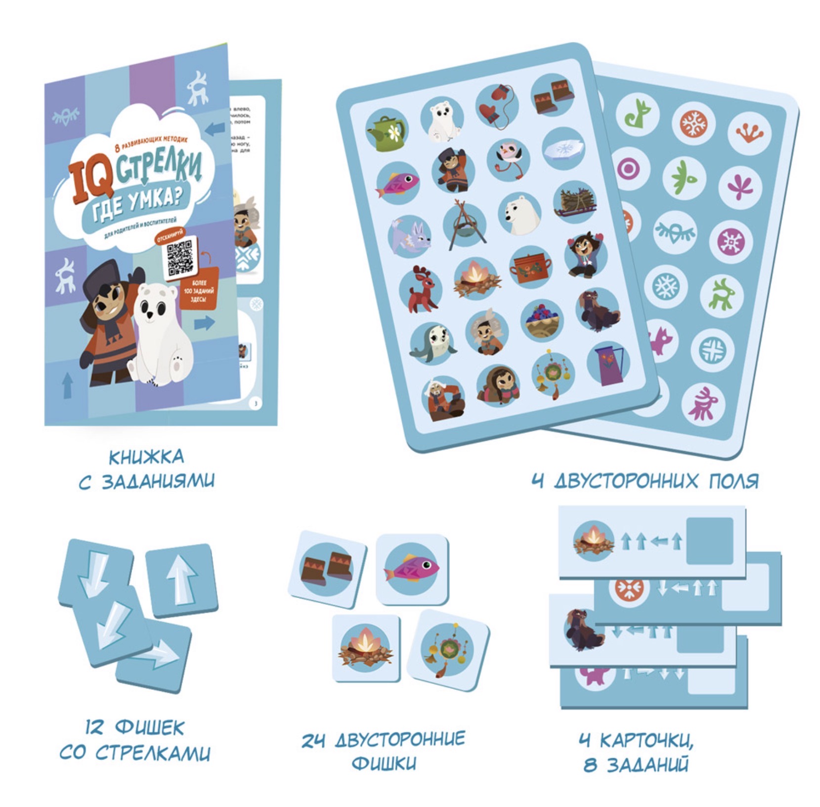 4 двусторонних поля с героями любимого мультфильма.24 фишки с картинками.12 фишек со стрелками.4 карточки с заданиями.
