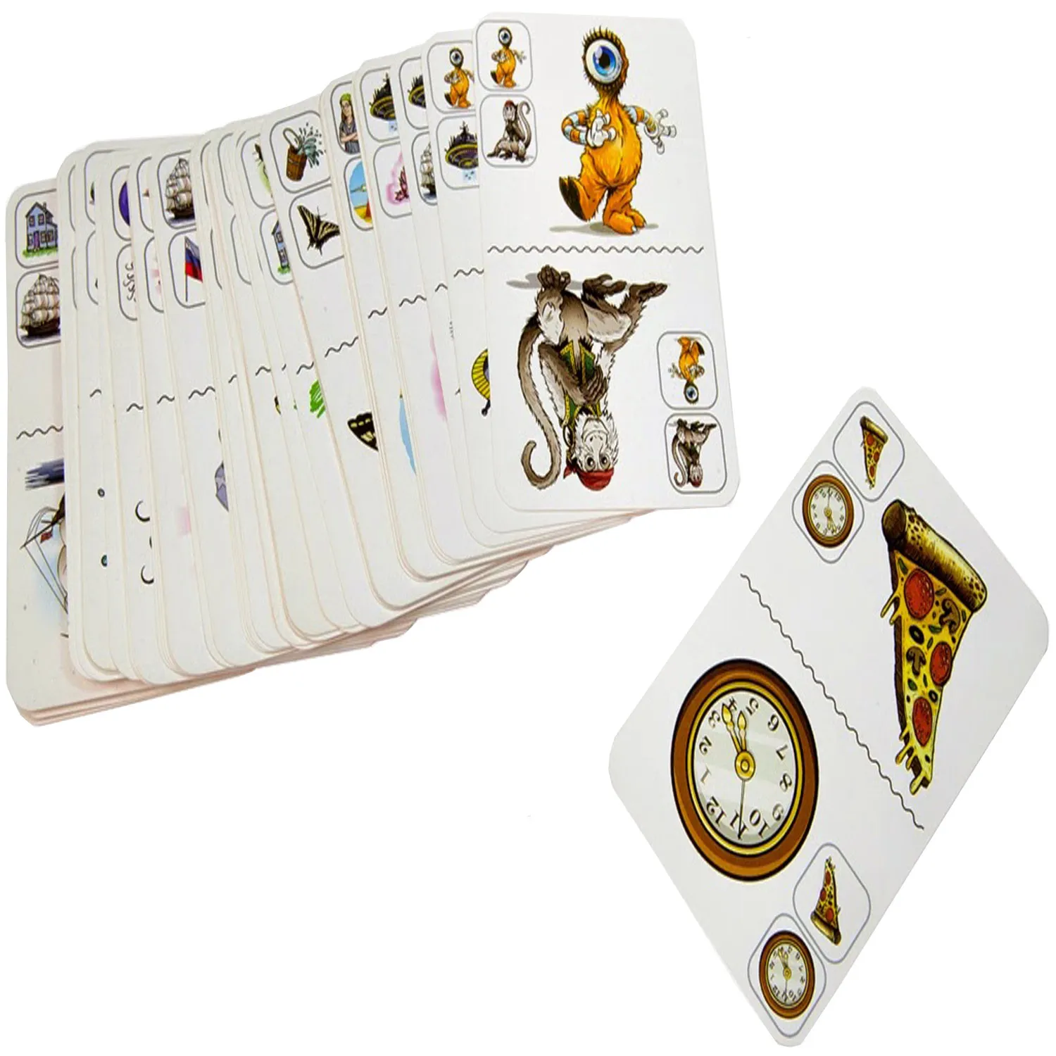 Быстрая зажигательная игра, участники которой наперегонки избавляются от карт на руках. Вы можете скинуть карту, если одна из двух её картинок совпадает с картинкой на карте, лежащей на столе. В этой лихорадочной карточной куче-мале побеждает самый быстрый и самый удачливый игрок!