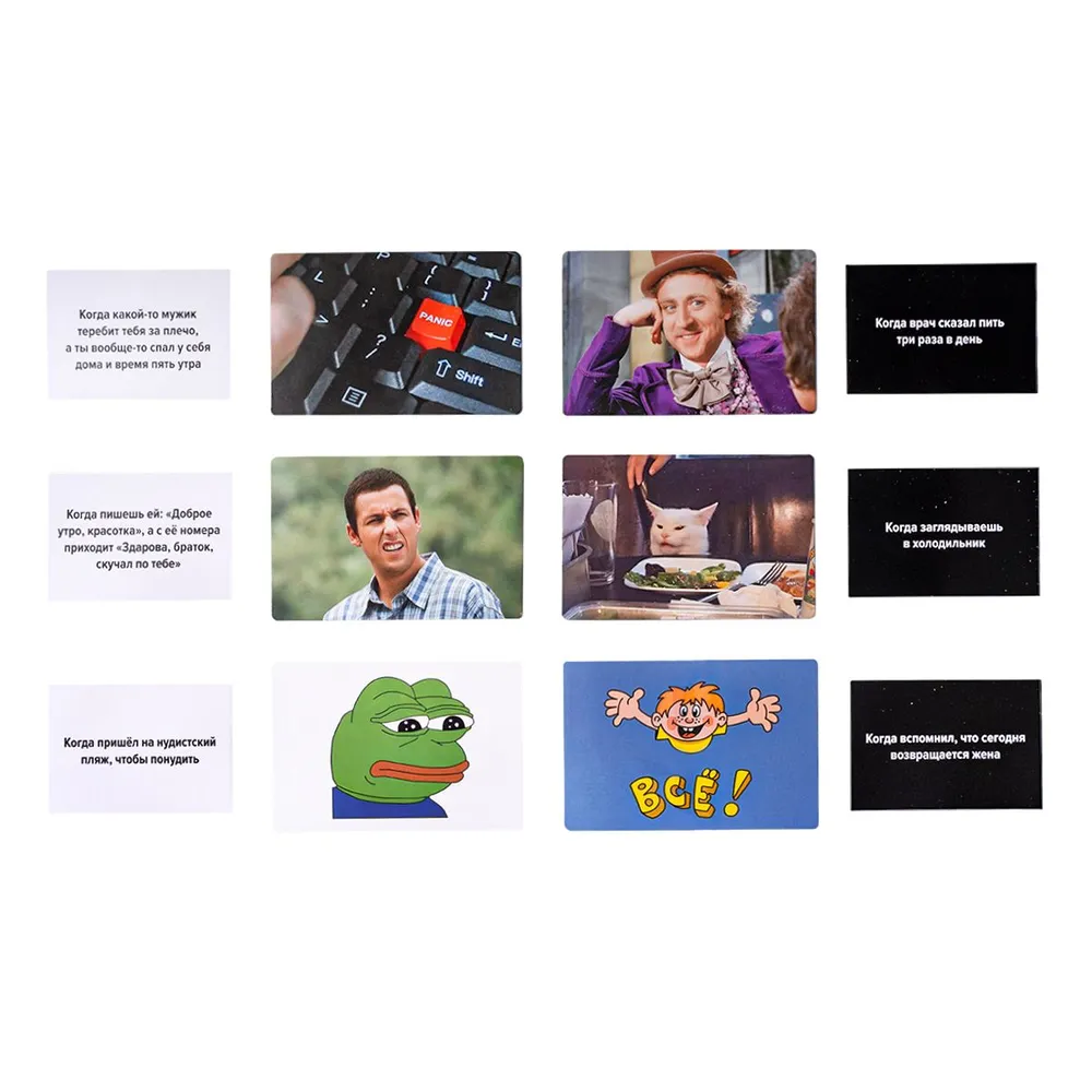 Состав игры: карточки с мемами - 200 шт., двухсторонние карточки с ситуациями - 160 шт., инструкция. материалы: картон, бумага. предназначена для лиц 18+ и рассчитана на 3-12 игроков.