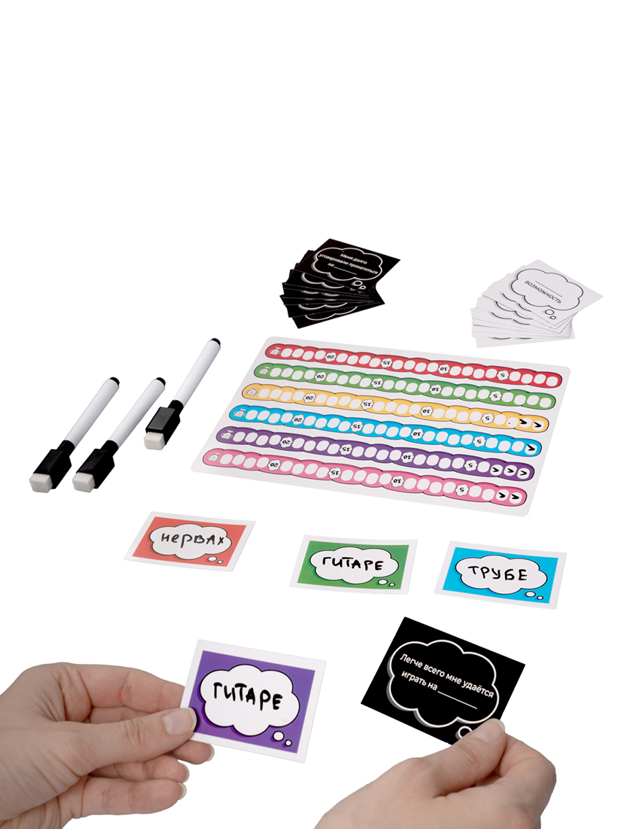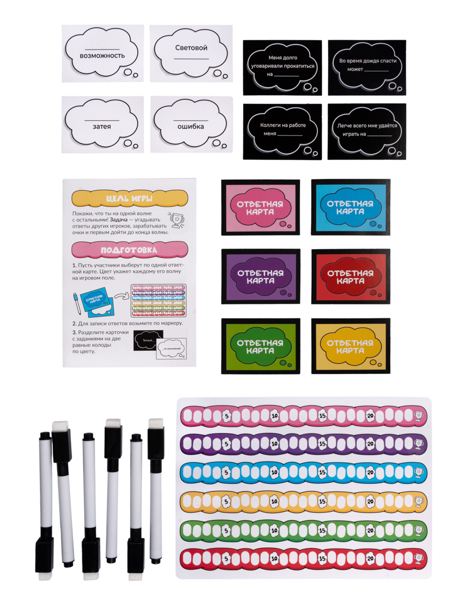 Каждый участник выбирает по одной ответной карте и маркер для записи ответов. Цвет укажет каждому его волну на игровом поле.