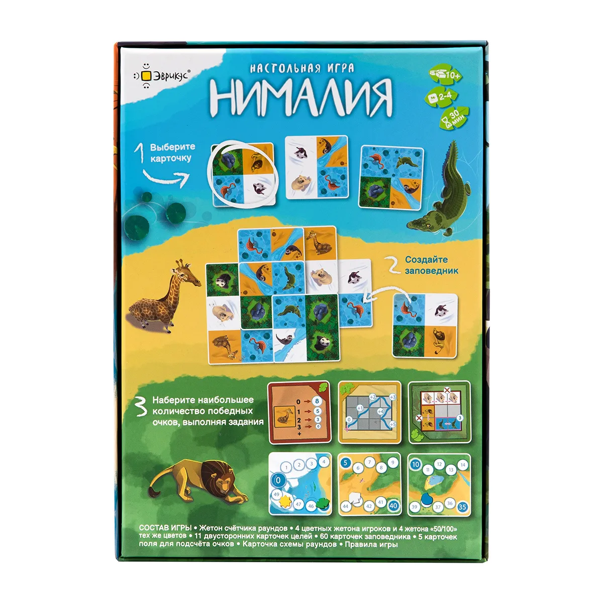 В настольной игре «Нималия» игрокам предстоит создавать заповедники, где все животные будут жить в гармонии. Но достичь такого удивительного баланса будет непросто: игрокам придётся думать на шаг вперёд, чтобы создать заповедник, наилучшим образом учитывающий потребности всех животных! Кому подойдёт эта игра? - всем: семьям, детям, молодёжи. - любителям игра на комбинаторику, - любителям игр на пространственное мышление Как играть? Сначала игроки выбирают квадратные карточки с животными и размещают их перед собой. Игровое пространство ограничено квадратом 6*6, так что придётся решать, как положить новую карточку территории, каких животных перекрыть, а каких оставить видимыми. В конце каждого раунда игрокам будут начисляться очки в зависимости от выполнения условий карт целей. Всего в игре 4 карты цели, но в каждом раунде учитываются 2 или 3 из них в разном сочетании. Важно не только получить максимальное количество очков сейчас, но и одновременно подготовиться к следующим раундам. Игра заканчивается в конце 5-го раунда. Выигрывает участник, набравший больше всех победных очков. Характеристики Аудитория для вечеринки , для всей семьи , для девочек, для друзей, для мальчиков, для молодёжи Игровая механика абстрактная, кооперативная игра, на координацию, объёмная, составление или сбор наборов, тактическая Количество игроков от 2 до 4 Минимальное время игры, минут 20 Развитие навыка абстрактное мышление, логическое мышление, моторика, на ловкость, пространственное мышление, тактильные навыки, тактическое мышление Рекомендуемый возраст от 10 лет