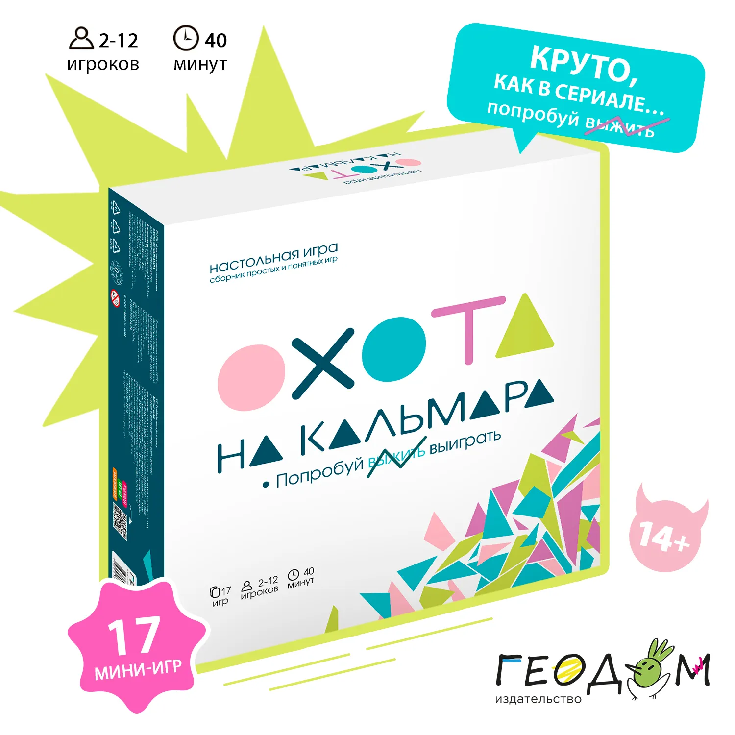 Большая игра на выживание – это 5 раундов для самых азартных и 17 игр на выбор в одной коробке! Откройте «Охоту на кальмара» – и сделайте свой выбор! Вас ждут испытания на сообразительность, скорость, внимание, азарт и везение – командные и личные, сложные и лёгкие. Побеждайте, двигайтесь вперёд и срывайте маски с соперников – чтобы стать лучшим охотником на кальмара! Внутри – большое игровое поле и двусторонние мини-поля, игровые карты с дополненной реальностью, карточки заданий и карточки ролей, игровая монетка, камешки-марблс и фишки. Количество игроков: 2–12. Рекомендованный возраст: 14+.