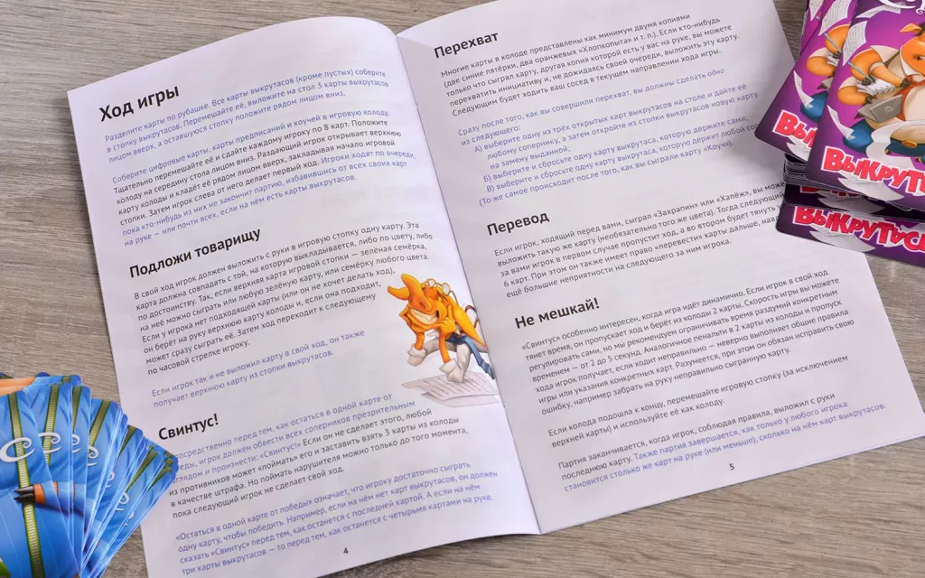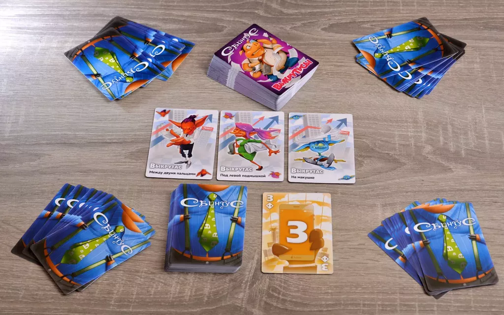 Свинтус — игра безумно весёлая сама по себе, но вместе с Выкрутасами — это сумасшедшее веселье и хохот до глубокой ночи. Выкрутасы — это специальные карты, которые нужно держать где-то на себе: между коленями, на макушке, под подбородком. И продолжать играть! Чтобы избежать выкрутасов, будьте внимательны — выбирайте правильные карты и кладите их вовремя. Прекрасная игра для друзей на вечеринке и для всей семьи. То есть, вы можете сыграть в Свинтуса по обычным правилам, а можете добавить Коучей и Выкрутасов — игра станет сложнее и разнообразнее. А хотите — придумайте свои собственные Выкрутасы! Для ваших идей внутри есть 28 пустых карт выкрутасов.