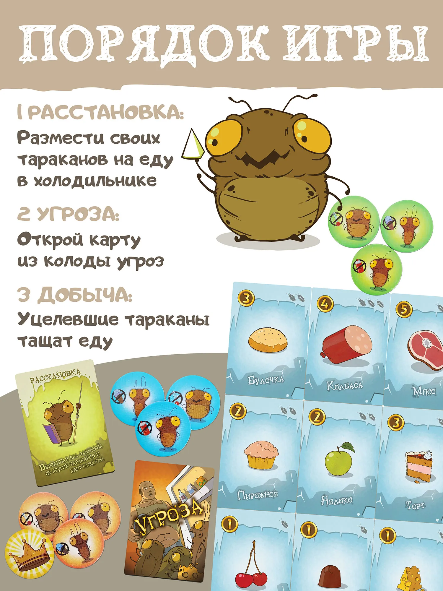 Тараканы в холодильнике - семейная карточная игра для 2-4 игроков. Каждый игрок управляет командой из 3 тараканов. Их цель - унести как можно больше еды из холодильника. Перед началом каждого раунда на столе выкладываются карты еды в 3 ряда по 3 карты. Это холодильник, на который будут совершать набег тараканы. На каждой карте еды указывается ее цена - количество очков, которое она принесет игроку. А также вес - количество тараканов, которое нужно, чтобы унести эту еду из холодильника. Игроки по очереди выкладывают свои жетоны с тараканами на любые (в том числе уже занятые) карточки с едой. У каждого игрока по 3 жетона своего цвета. После того, как все тараканы разложены, наступает фаза "Угроза". Открывается верхняя карта из колоды "Угроза". На этой карте обозначена сама угроза (дихлофос, тапок, мороз или динамит), а также области холодильника (клетки в таблице), на которые эта угроза подействовала. У каждого таракана есть иммунитет только к одной из угроз, при этом от динамита не защищен никто. Если таракан находится на клетке, по которой попала угроза и у него нет иммунитета к ней, он погибает и жетон возвращается к игроку. Теперь выжившие тараканы могут забрать еду. Игрок может забрать карточку с едой, если на ней есть достаточное количество его тараканов и при этом их больше, чем тараканов других игроков. Оставшиеся тараканы остаются в холодильнике на следующий раунд, при этом, они становятся прожорливыми и их сила увеличивается на 1. В холодильник добавляется еда и начинается новый раунд. Каждая карта еды имеет свое свойство, оно написано на обратной стороне карточки. Например, подсмотреть карточку угрозы, убрать или переместить одного из тараканов соперника, защитить еду от других тараканов ... Забрав карточки еды из холодильника, игрок может применять эти свойства, чтобы помочь своим тараканам и насолить соперникам. Игра заканчивается, когда заканчивается еда в холодильнике. Выигрывает игрок, набравший наибольшее количество очков.