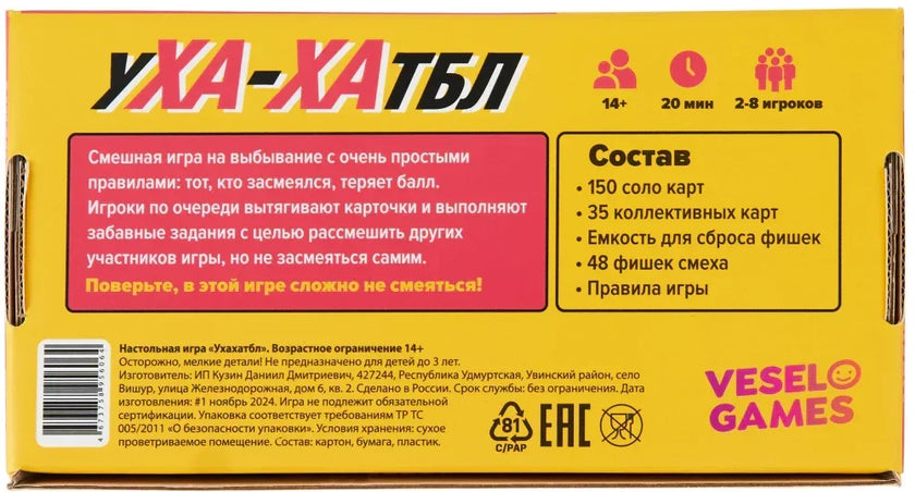 Настольная игра для детей и взрослых "Ухахатбл" — это потрясающий способ весело провести время в компании, где главное испытание — сдержать смех! Подойдет для вечеринок, семейных встреч или дружеских посиделок.