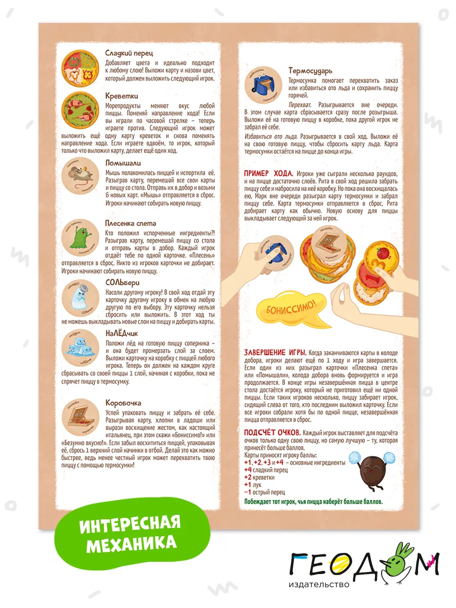 Простая и быстрая игра для компании друзей или семейного вечера научит побеждать, действовать быстро и никогда не унывать – просто приготовить новую пиццу! «Una pizza, per favore!» – а вот и новый заказ.