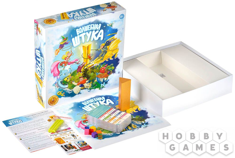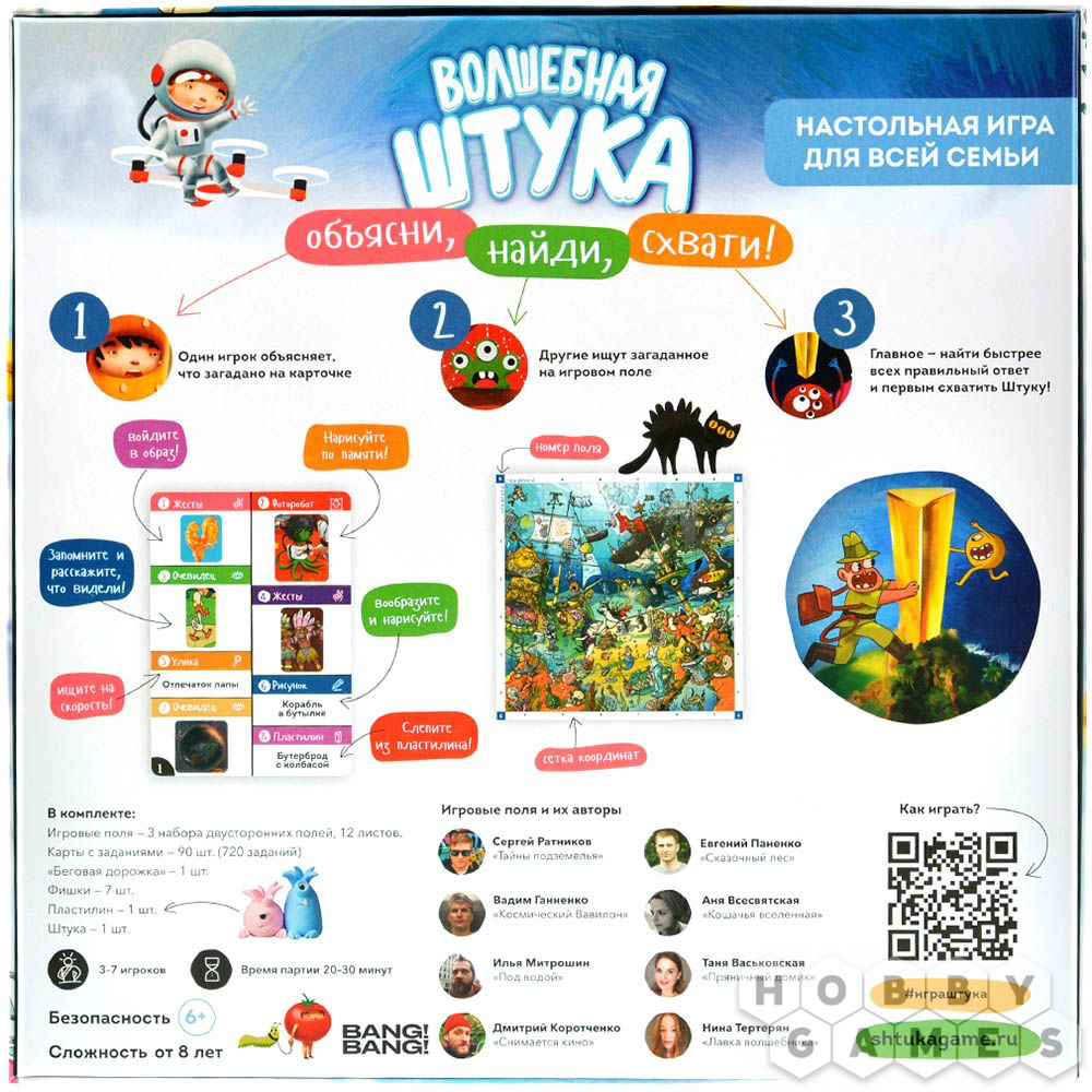 "Волшебная Штука" – это независимое продолжение веселой игры "Штука". Игроки, как и в предыдущих версиях, ищут на залипательных игровых полях то, что загадал ведущий. А объяснить загаданное не так просто, как может показаться с первого взгляда. Слова существительные строго под запретом! Конечно, кроме слов "штука" и "существо". А как ещё помочь недоумевающим игрокам? Рисуйте! Только чур не подглядывать в поле! Слепите скульптуру из пластилина или импровизируйте! Знаете правильный ответ? Скорее схватите "Золотую штуку"! Если ответ верный, то ваша фигурка продвигается вперёд по игровому полю. А если ошиблись, то назад...