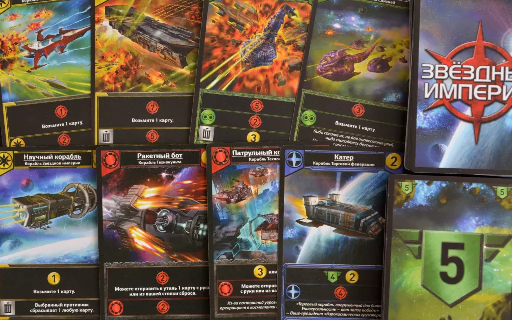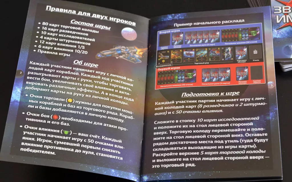 Представьте, что в вашем распоряжении — целый космический флот, а впереди — бескрайняя галактика. Так и начинается игра — у каждого своя колода с кораблями, и каждый ход вы их разыгрываете. Можно торговать, атаковать противника и строить базы, которые защитят вас от чужих атак. Здесь всё зависит от вашей личной стратегии, а она может быть любой. Главное — накапливать очки торговли, боя и влияния и атаками понижать очки противников. Таково условие победы. Это атмосферная игра в жанре научной фантастики для 2 игроков. Что входит в подарочный набор?
