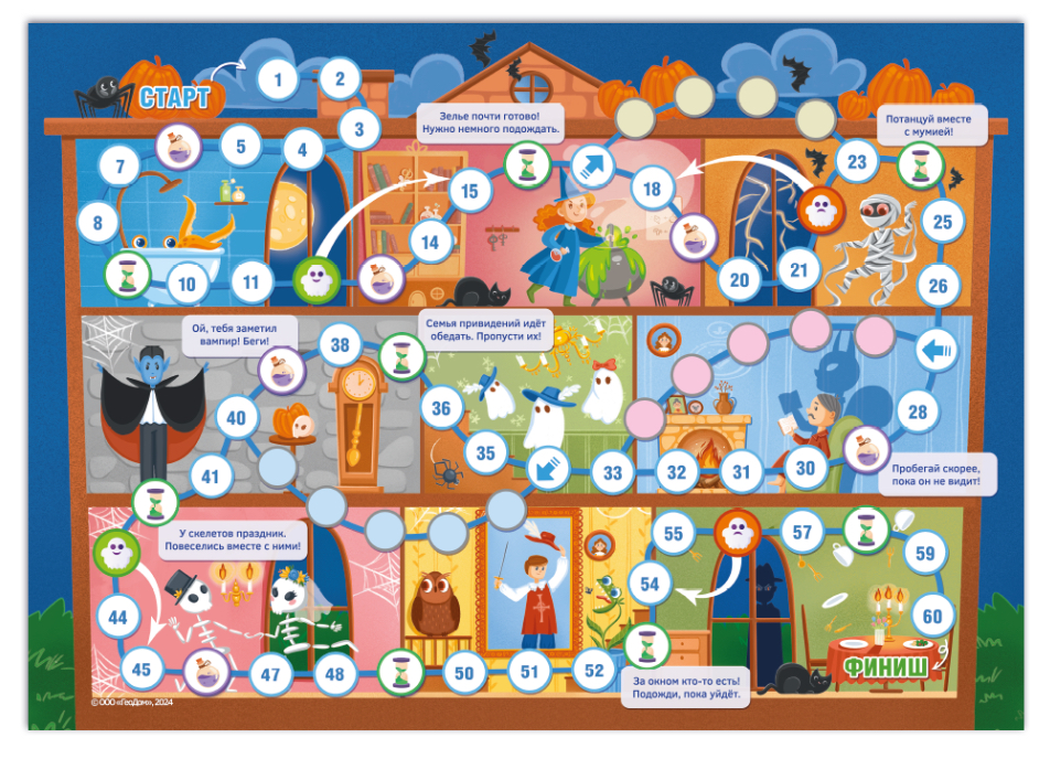 Новая игра-ходилка «Дом с привидениями» имеет удобный формат и подойдёт для всей семьи! Разложите поле, выберите фишки и отправляйтесь в весёлое путешествие по симпатичному дому, где бродят забавные призраки! Компактное поле легко разложить и удобно брать с собой: игра складывается до формата А5. Игра тренирует счёт, развивает мелкую моторику и внимание. В комплекте: игровое поле 42×29,7 см, кубик и 4 фишки. Рекомендованный возраст: 6+.